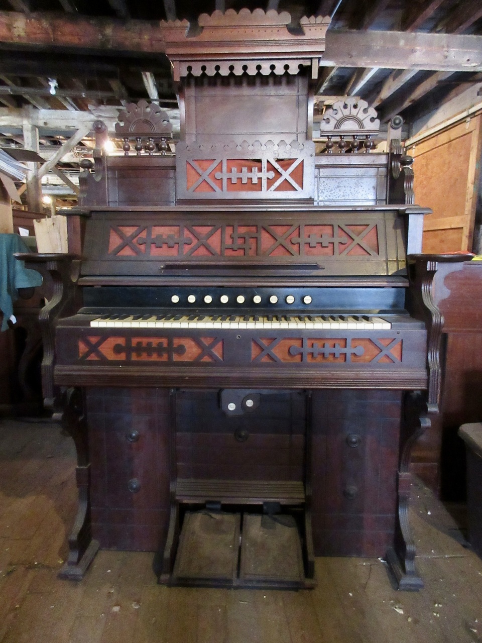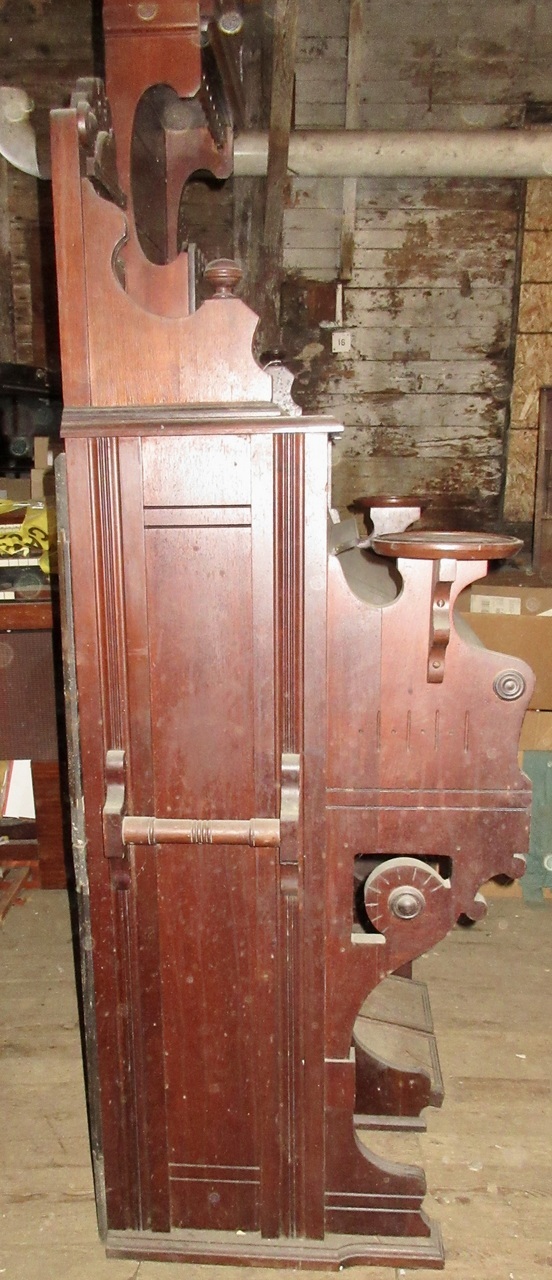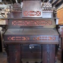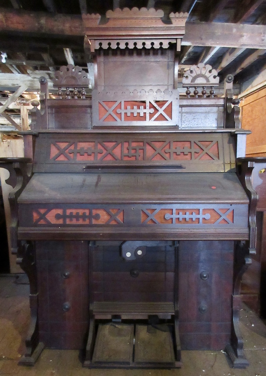Knee levers: Right = "knee Swell"; Left = "Grand Organ" [so labelled]. Celluloid keys; treadles are 10 5/8" X 7 5/8", with walnut side frames, "?" toe guard and simple metal heel guard. Photos added and registration info updated in May 2024.