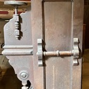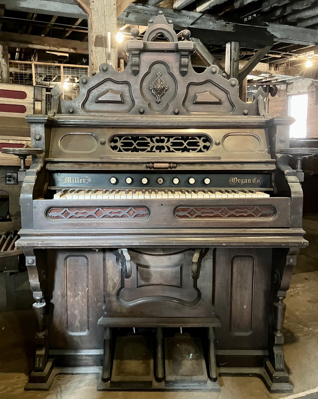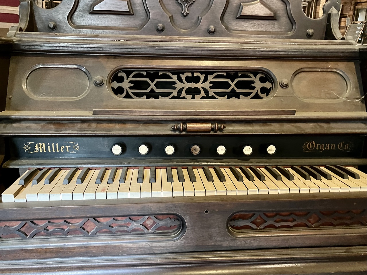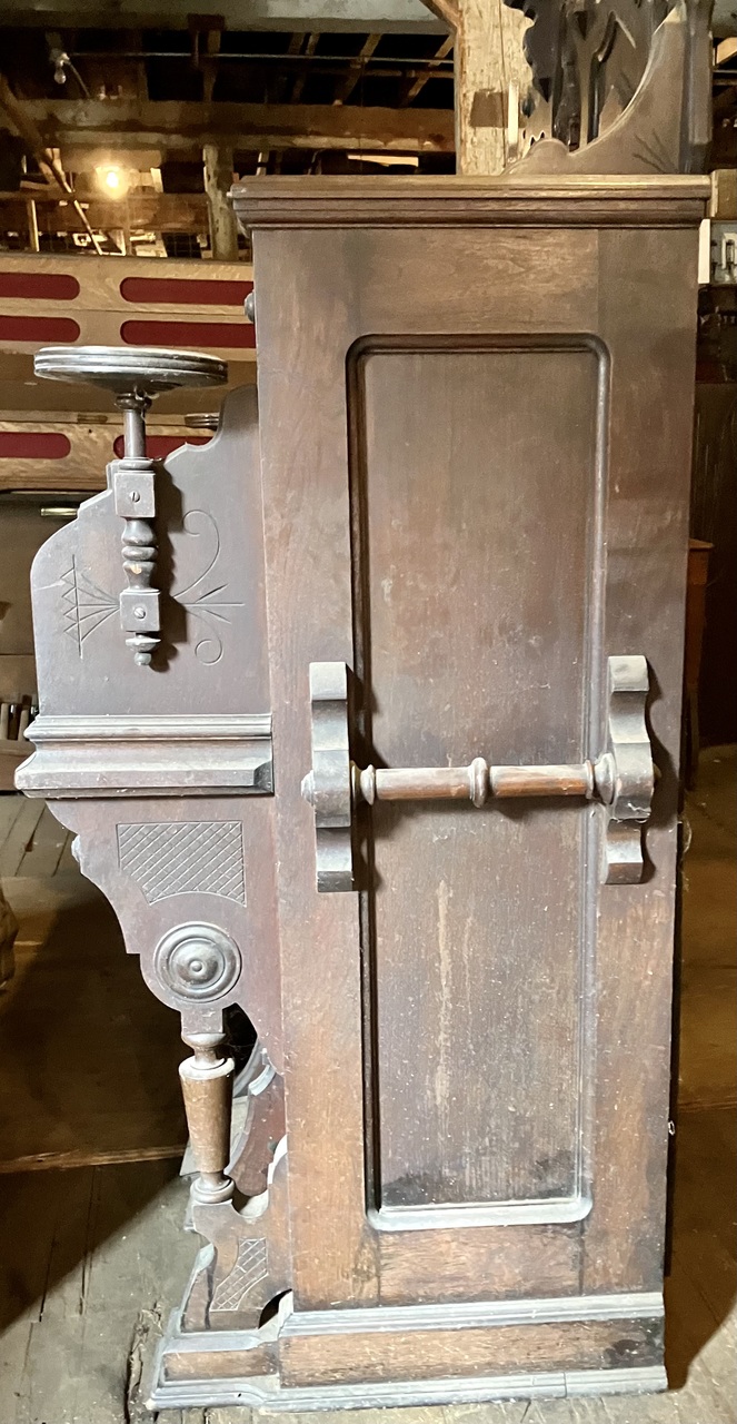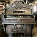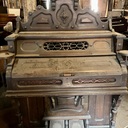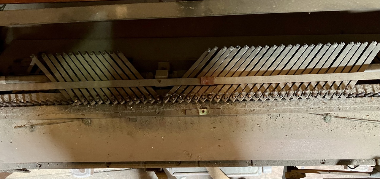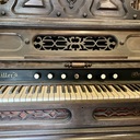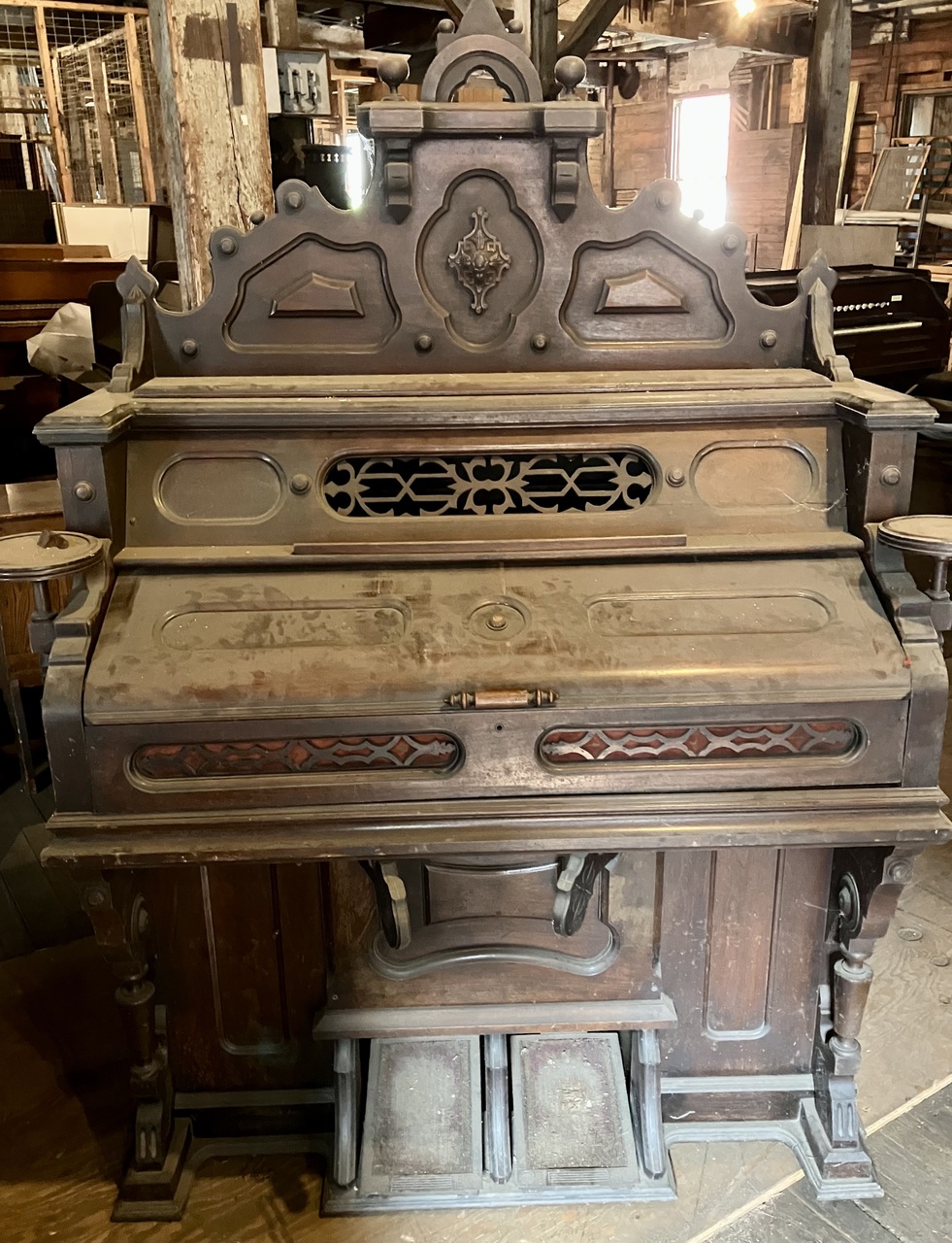 Treadles: 7 X 10 3/8"; cast frame, with globe in corners; no name; :camel hump" toe guard cast in. Stop faces are almost certainly not original--I and II Forte are Estey names.
