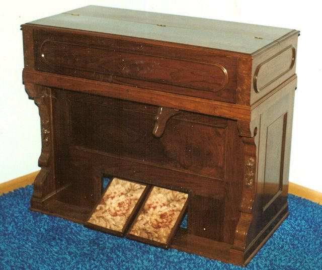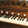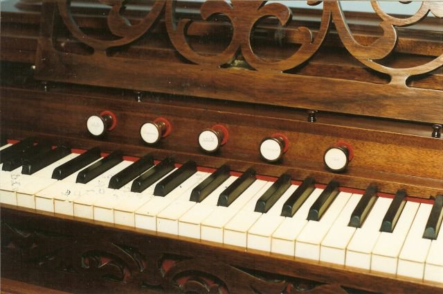 Current pitch is A-440. Bass/treble break at B/C. There are no serial numbers or other ID on organ. The number 87 appears in pencil on several keys and on swell covers. The tremelo is a box and flapper type.
