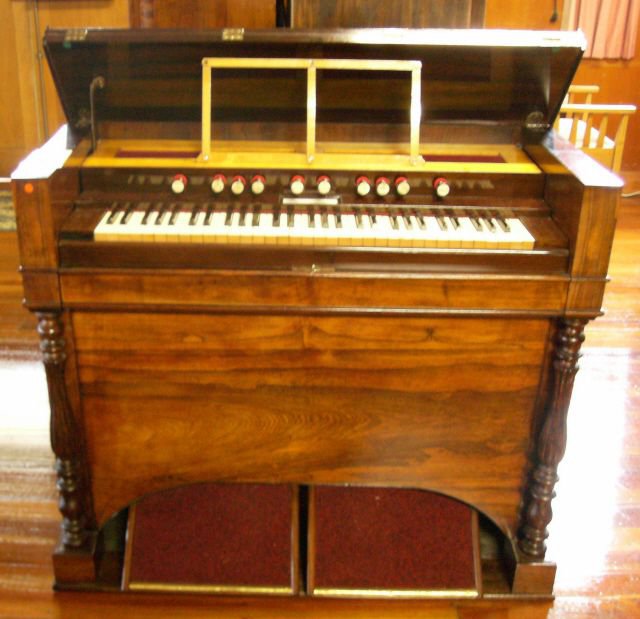 Located at Woodville Organ Museum, New Zealand #92a. Action was numbered 31121 and dated 1863. Case was #12676 and dated 1857. Dates found inside case. Bass/treble break at keys 29/30. Stops had staff and notes on label.