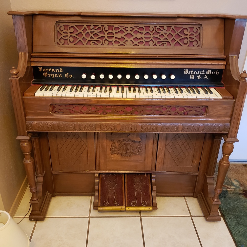 I spent almost 3 years on it. It still has a few problems, the right foot pedal is rotted in one corner and won't hold the screw attached to the bellows strap, so the pedal is unstable. I can't find anything authentic to hold the music doors shut. I have the original knobs and chains, but the pieces that lock them don't work. However, after I had my 1905 baby grand piano tuned, I tested the organ against it, and it is still in tune. This organ was my grandmother's, then my mothers, and she painted it WHITE (*! ) then it sat in our basement when I was a little girl. It went through two floods of 3' high water - so it smelled horrible, musty, rotten, when I finally had it sent to me in Arizona. I do remember seeing the top (and wondering what it was) sitting in my grandma's garage in Michigan when I played in there as a little girl, but they must have dumped it. I still don't know enough about reed organs to answer all the questions on the form. However, now that I am retired and have more time, I will study up. I enjoy the ROS magazine.