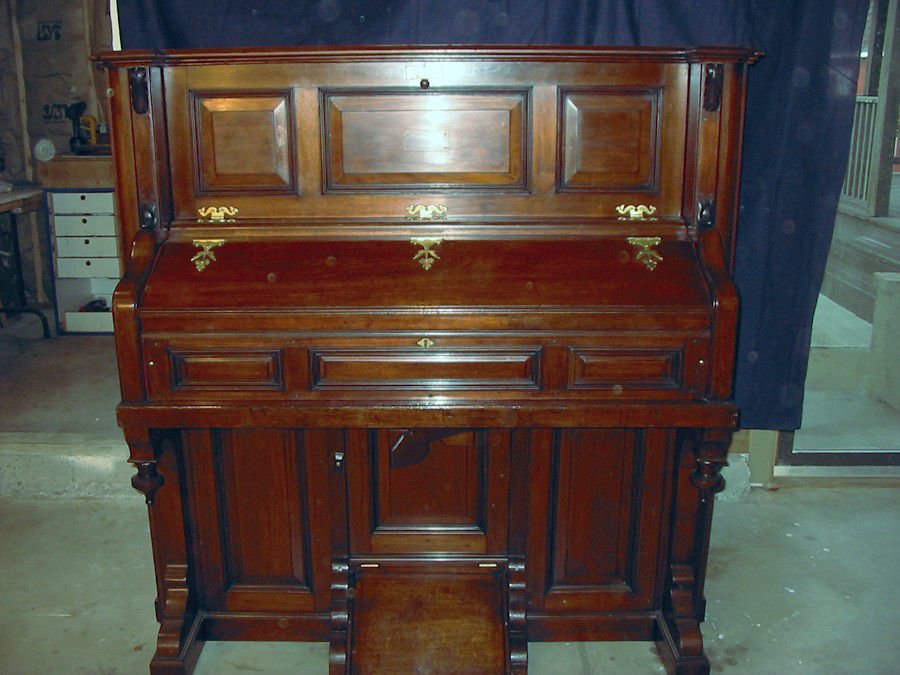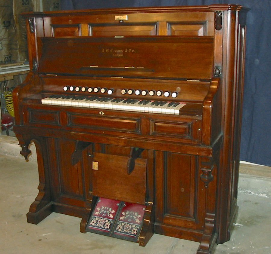 (?) behind stop name indicates replacement stops and may not be accurate. Pitch is A445, reeds stamped with a pat. date of 1888. Bass/Treble break at keys 28/29. Orig. reg. as an Estey.