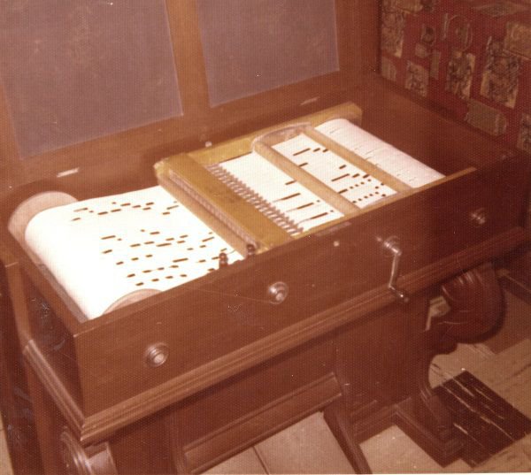 Dimensions: 36, 18.25, 33.5", Patent Date Jan. 10, 1879. Wind supplied with treadles, roll moved by hand crank. Paper roll perferation 3/8" wide.