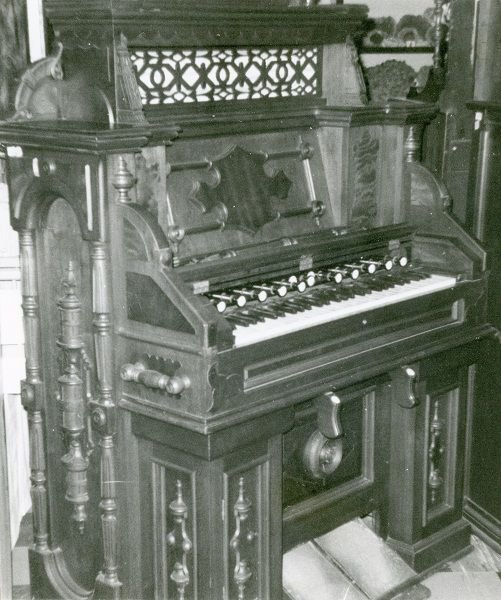 Bass/treble break at E/F. Ceramic stop faces including knee stop faces, keys are ivory, swell activates shutte in panel below keys. Dimensions are 47.5, 23.25, 49+43.25"H. The chimes? are tuned saucer bells. The swell lever actuates shutter.