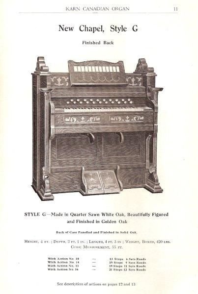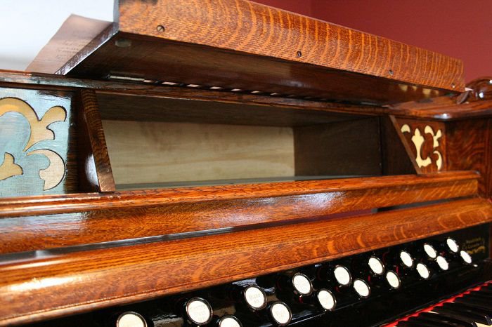 Purchased in 2011 from the Cobourg Ontario area. Restored in 2011. Tuned to A440. Contains 5 - 28 reed ranks (Bass), 5 - 33 reed ranks (Treble), 1 - 13 reed sub bass Total reeds: 318