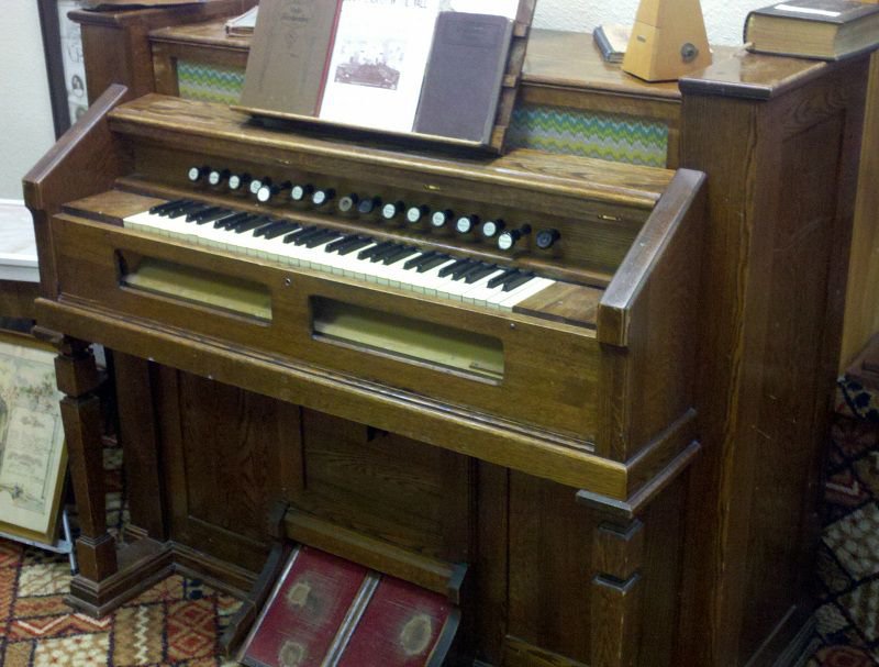 Located in the Mott Gallery of History & Art, Mott, North Dakota. None of the stop faces are correct, most don''t even belong on an Estey organ. The organ is still playing fairly well.