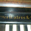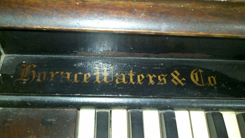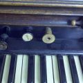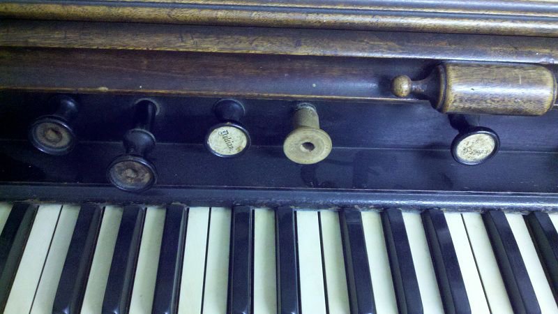 Located at the Hebron Historical Museum in Hebron, North Dakota. If you look closely at the name on the stop board, you can see the outline of a stencil overlay. Horace Waters did some manufacturing, but more often had organs made for him and he later added his name.