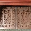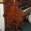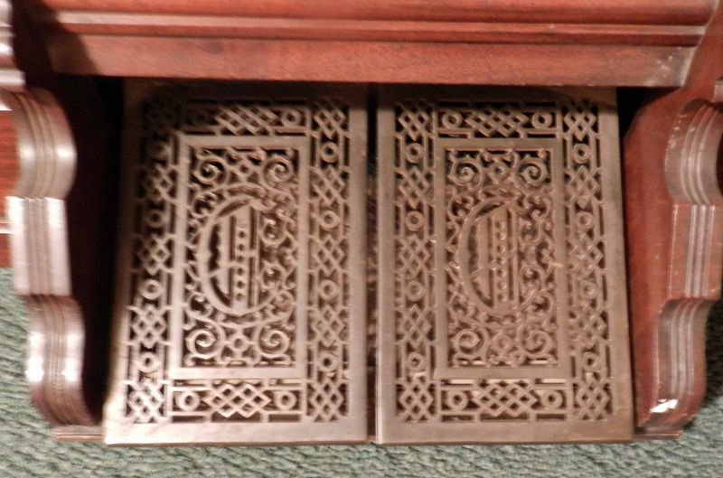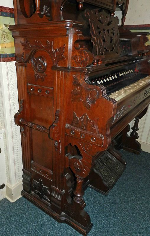 Located in Missouri, Bass/treble break at keys 36/37. Pitch is A435. Bass is: 4'',8'',16''. Treble is 2'',4'',8'', &16''. The sub bass is 36 notes with the upper 24 being in the reed stack with the lowest 13 being in a separate block in back. The reason it is totals 37 is because the bottom C is in both sets and sounds together. The center door glass is Bohemian cased glass. The dark purple color design was made with gold and fused to the clear glass. After this was done, the pattern was layed out and the purple layer was etched away revealing the pattern. It was very expensive in the day and not made anymore.