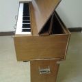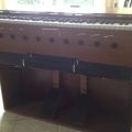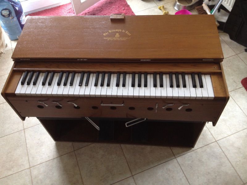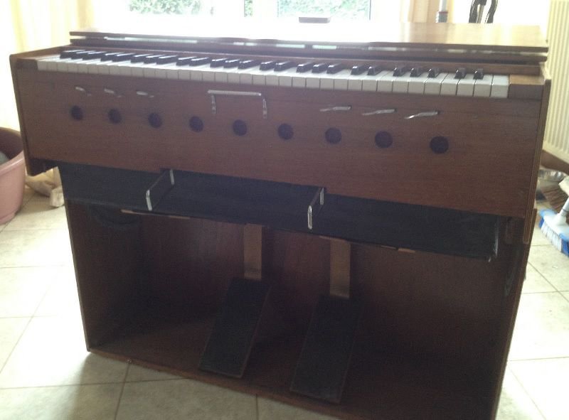 It has 4 octaves and the keyboard splits the reed banks at the F below middle C. There are 6 stops on the front (as seen in the pictures) which control the 4'', 8'' and 16'' reeds on both sides, and there are two knee levers - one for for the swell/shade mechanism and the other to open up all 3 sets of reeds whilst playing. Pitch is 451/452.