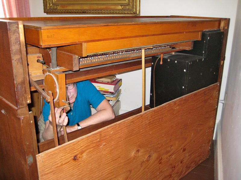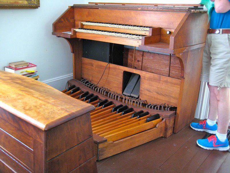 Located in Maine. Pitch is A435-440. Both manuals have 8'' ranks playing all the time (unmuted) See Gellerman Database #2439. Fan type tremolo is almost thee entire length of the wind chest. Vox Jubilante opens pedal swell shade. No stops for pedals that have 8'' reeds and 16'' on the bottom 12 notes, assumed to be always on.