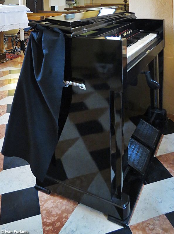 Located in Chiesa di San Vito, Vigonza, Italy. Could be a replated French harmonium. Has 154 reeds, with a bass/treble break at keys 29/30.