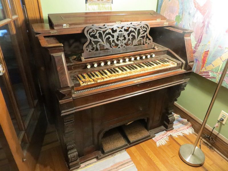 Located in New Jersey. Bass/treble break at keys 29/30.The instrument is currently unplayable as the winding system is mostly missing. Estimating bass/treble break from arrangement of reeds under the keyboard. Unable to give pitch levels of stops. Will update this entry once I restore this to playable condition.