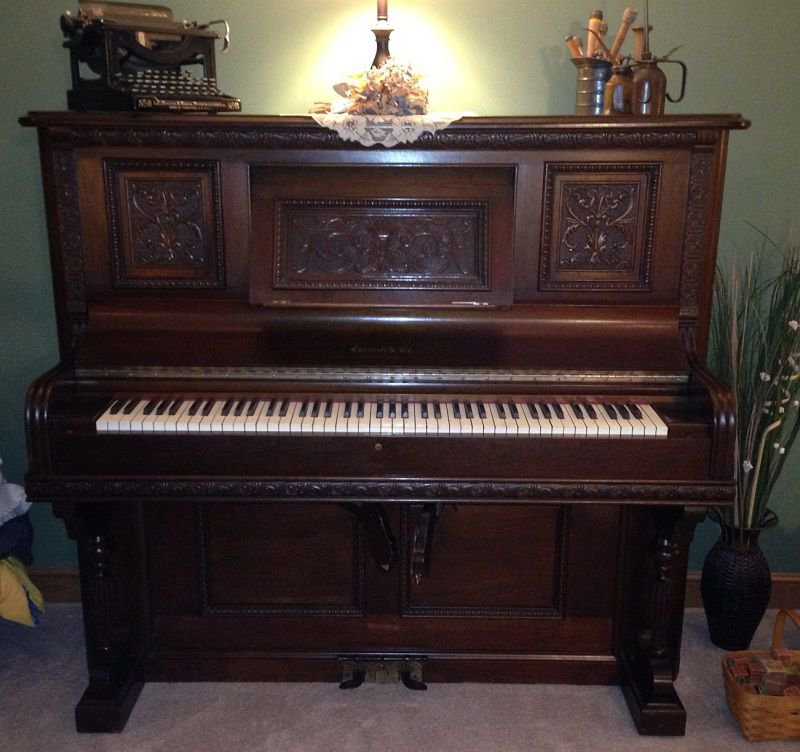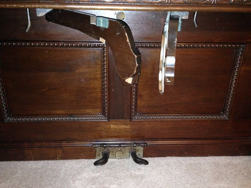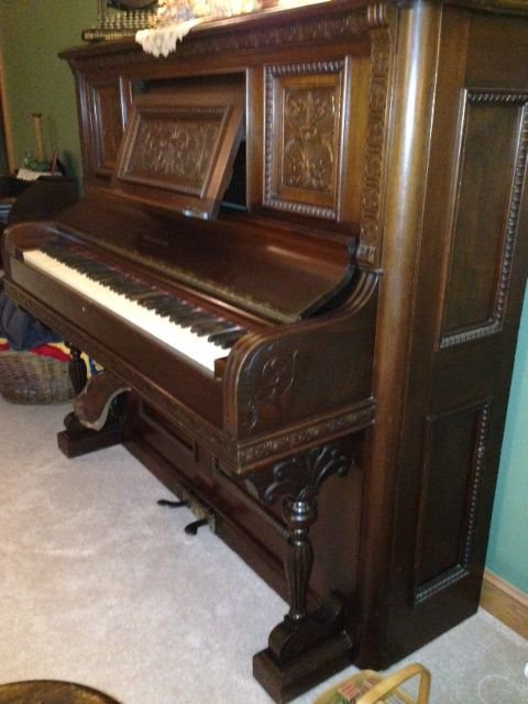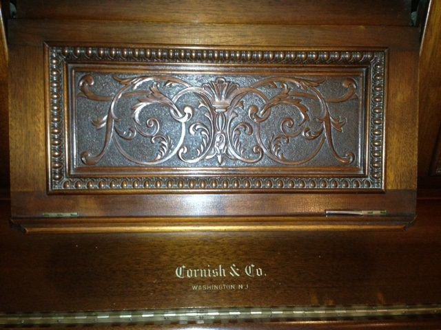 Pianosymil, Style 42,000. Came in Oak, Black Walnut and Cherry. Has 3 complete sets of reeds, or 6 half sets. The Melodia and Diapason reeds are always on. The knee levers do the usual swell and Grand organ functions. In addition, the left knee lever operates the Saxaphone reeds and the Octave Couplers. The right knee lever operates the Vox Celeste and Principal reeds. It sold for $85 new (on installment) or $81 cash in 1902.
