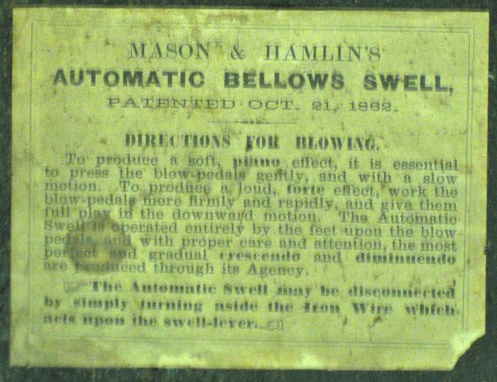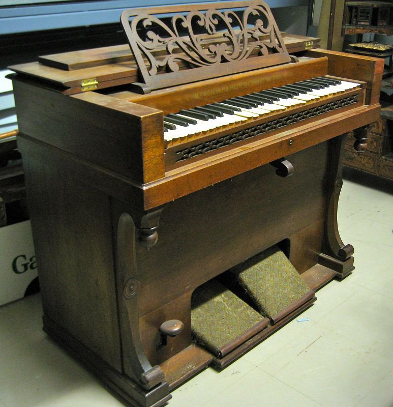 Located at the Penobscot Marine Museum, Searsport, Maine. Pitch is A452. Central knee lever opens the rear 4'' rank. Hitch down pedal opens front and back swells.