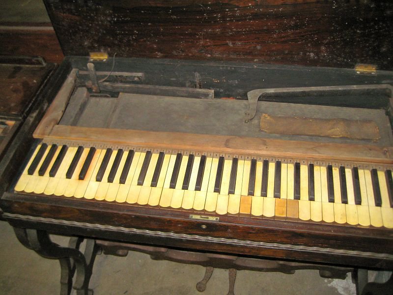 Located at the Pease Collection of Historical Instruments, Palmer, Massachusetts. Pitch is A455. Knob in treble jamb activates treble damper (patent 17,196-1855)
