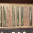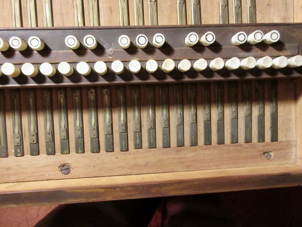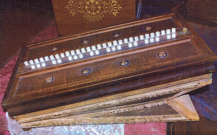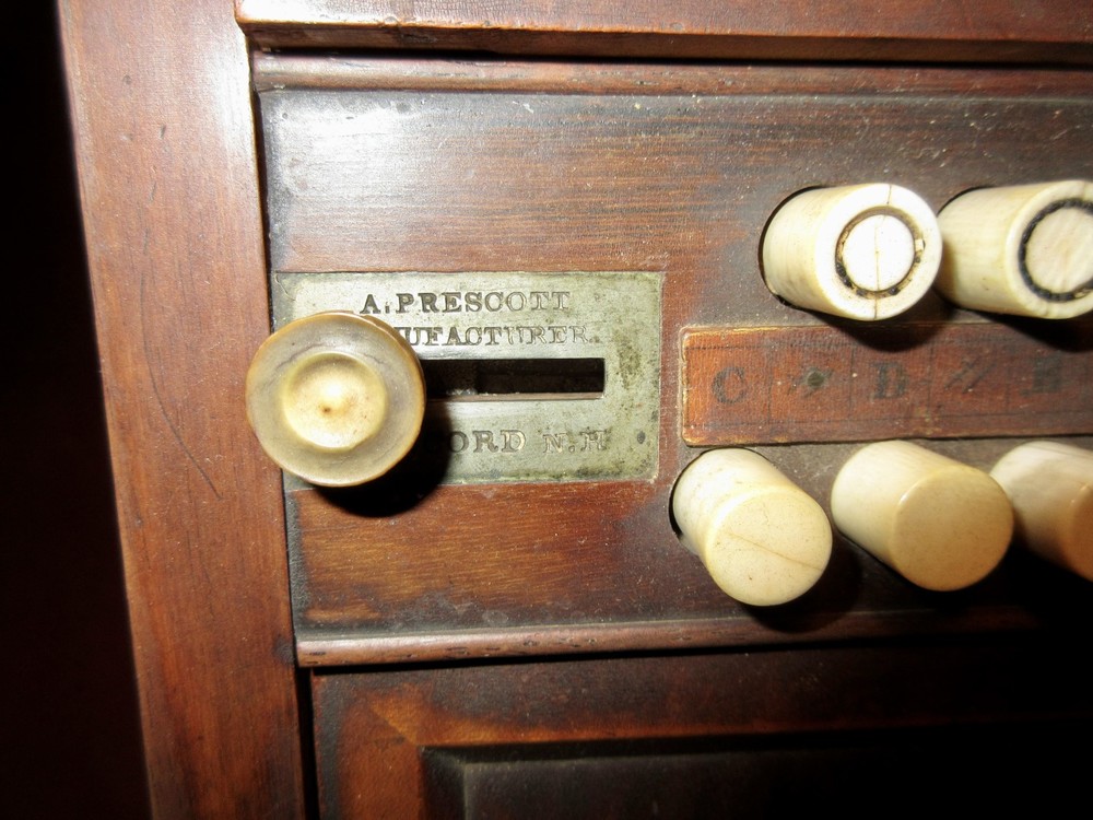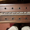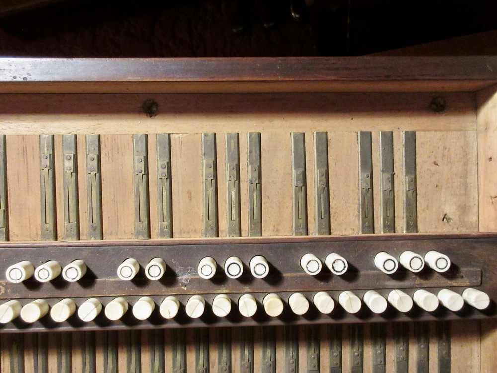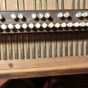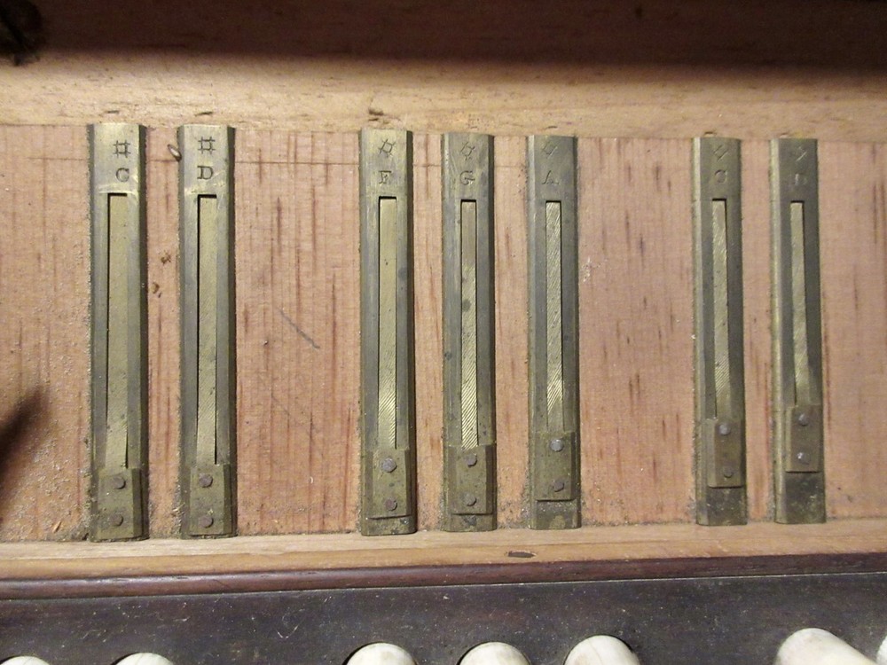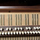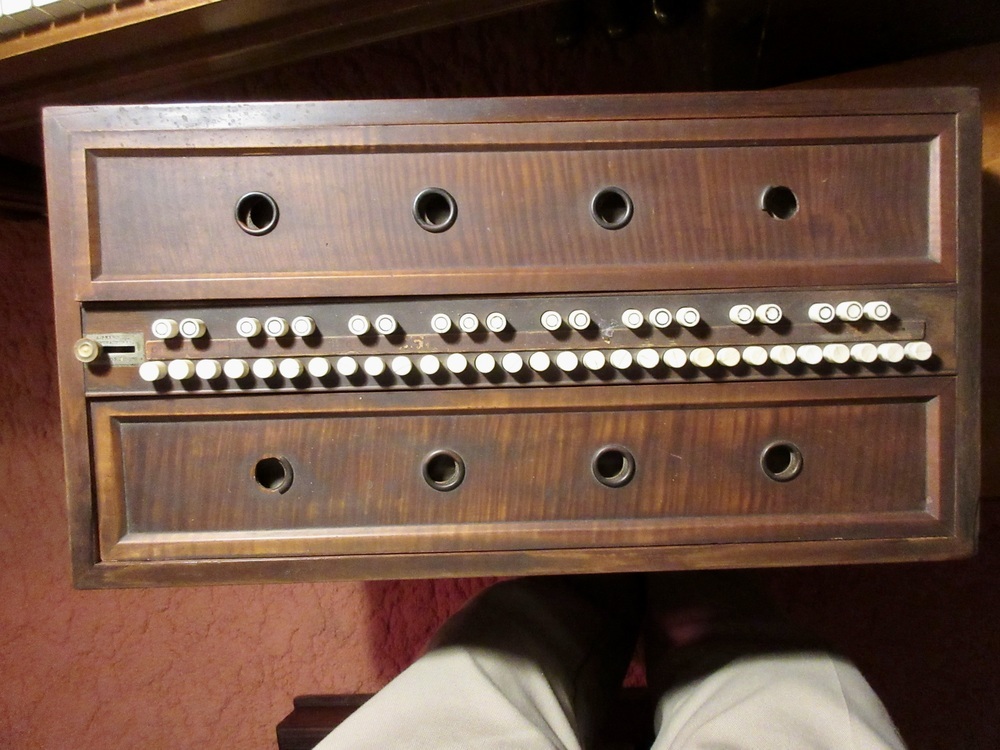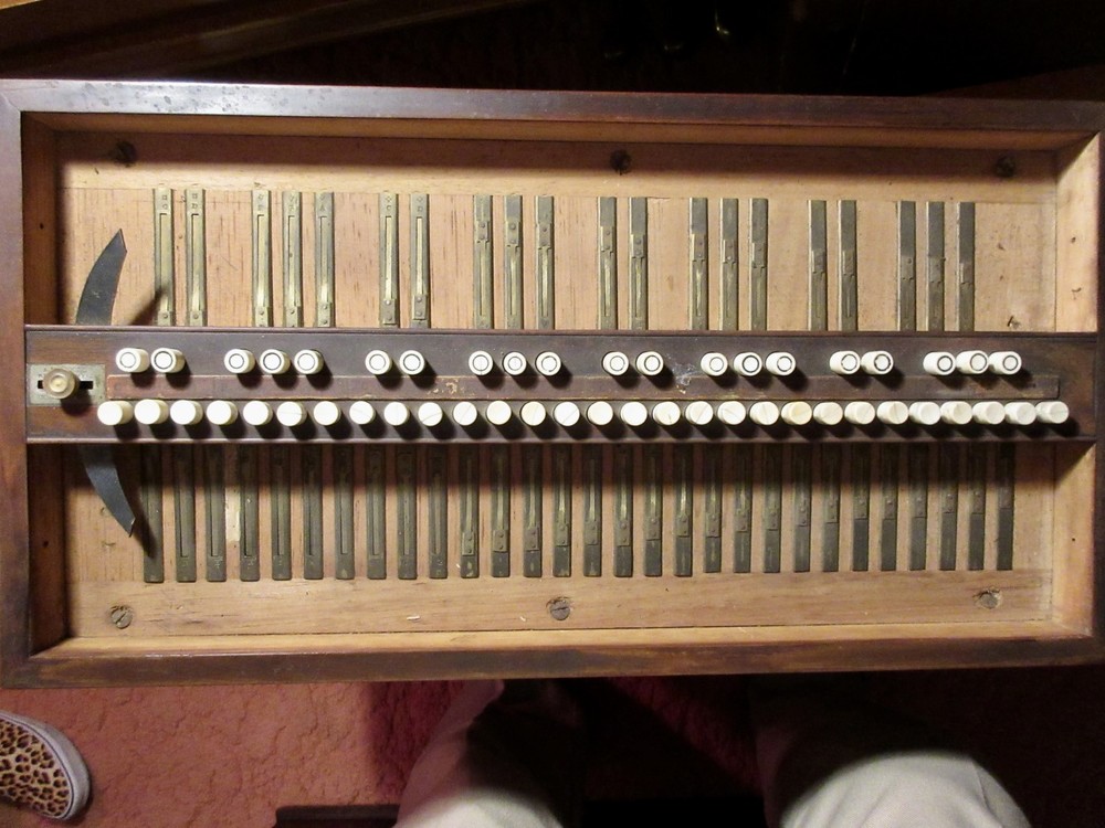 Located in Illinois. Rosewood veneer; tiger-striped maple reed chamber covers. Date found written in pencil on sound board. Paper strip between buttons indicates note "C, #, D, #, E, F"...etc. Button at Bass end of top moves a slider to cover four holes on each side of button-rows, = volume control.