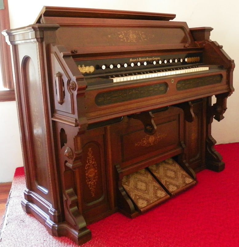 Located at the Freetown Historical Society, Freetown, Massachusetts. Pitch is A455, Bass/treble break is at keys 24/25, B/C. Voix Celeste stop opens the Melodia, Seraphone and an extra mute above the treble reeds.