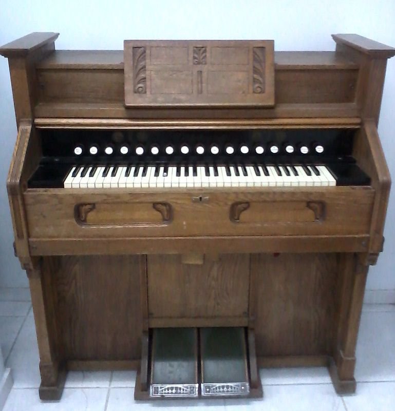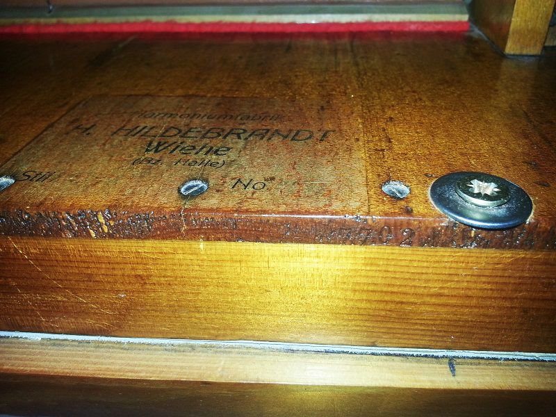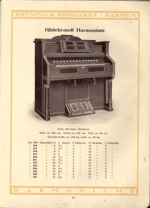 Located at the Baptist Theological Seminary of Buenos Aires, Argentina. The catalog page is from a 1925 catalog, Hildebrandt made harmoniums from 1899 til 1949. This organ was recently restored and the 1st pictures show the finished restoration. The last photos show before restoration and a advertising page for this organ.