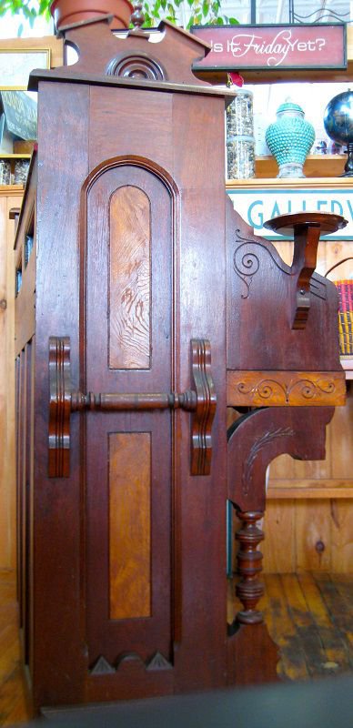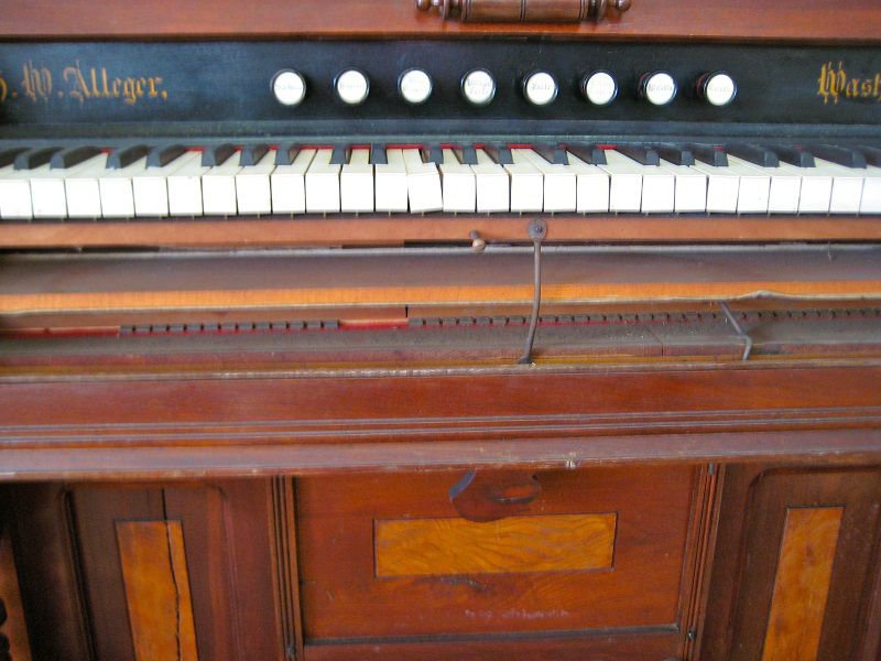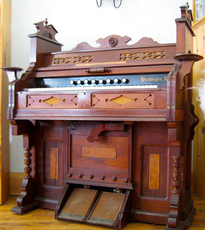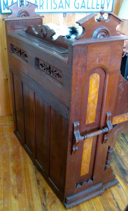 Located in Maine. Pitch is A448, Winding is reversed from most normal american style organs, exhausters in rear, reservoir in front. Date based mostly on serial number. Hand written note inside. ' Refurbished by H A Bonsey, Surry Maine April 9, 1912'.