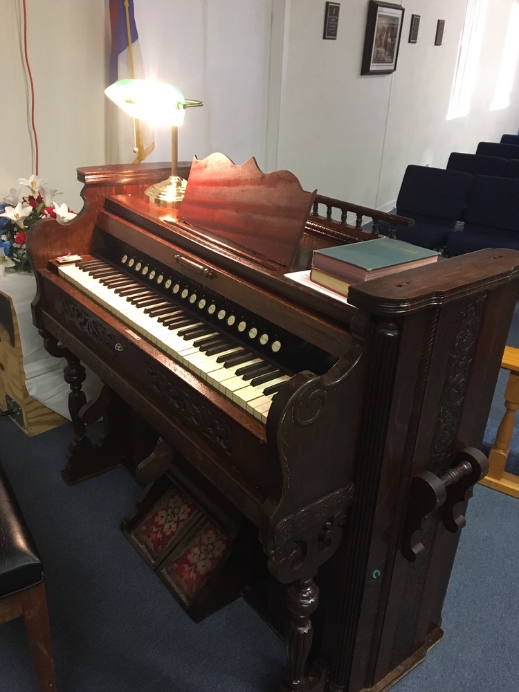 Organ was purchased in January of 2020 for restoration. Original cost of the instrument was around $80 dollars, according to a 1903 catalog. All other prior history unknown, other than that the instrument was in storage and required bellows work and tuning. The wood was a likely candidate for re-purposing. Original music desk, finials, and lampholders missing. The organ was restored over the course of approximately two months, after which it was donated to the First Baptist Church of Fellsmere, where it has accompanied weekly morning services since early March.