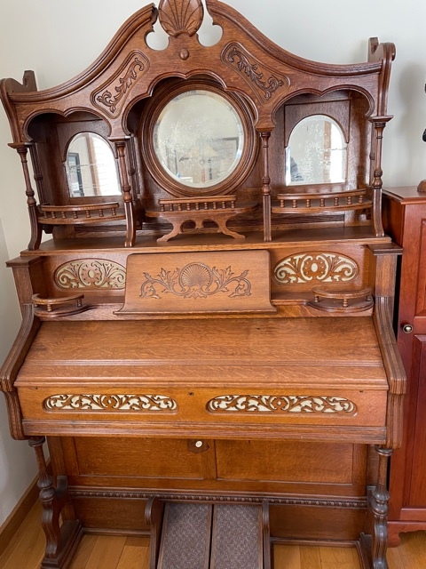 This organ is very ornate and has three beveled mirrors as well as curved candle shelves on the top case. It has not been played in probably 40+ years, but seems to have all the original parts. There are two "knee levers" marked "Grand Organ" and" Knee Swell". There is no stool.