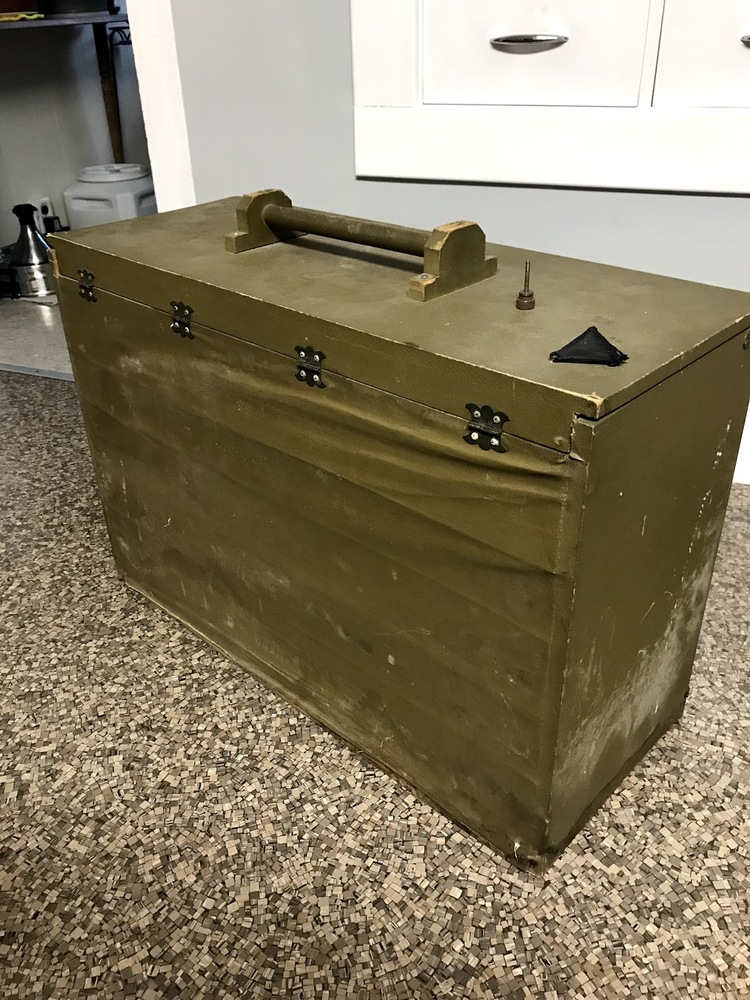 WWII portable folding field reed pump organ. Plywood case covered with canvas. Purchased from a family in Shawano, WI. Grandfather brought home after service in WWII.