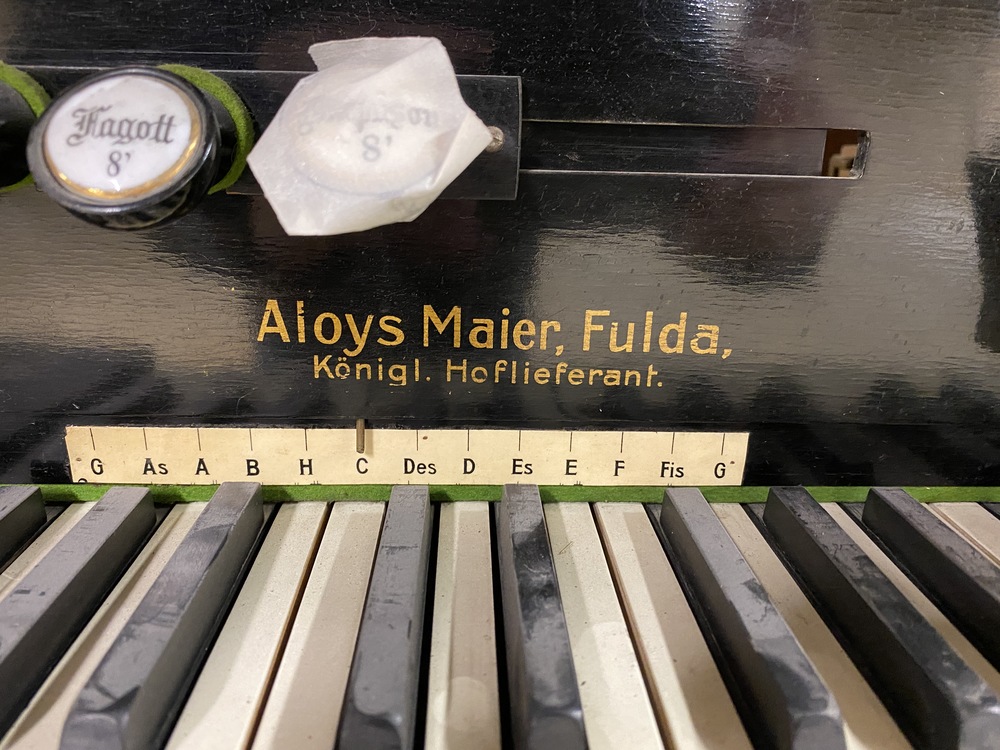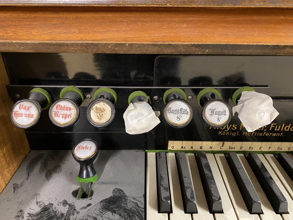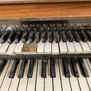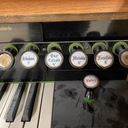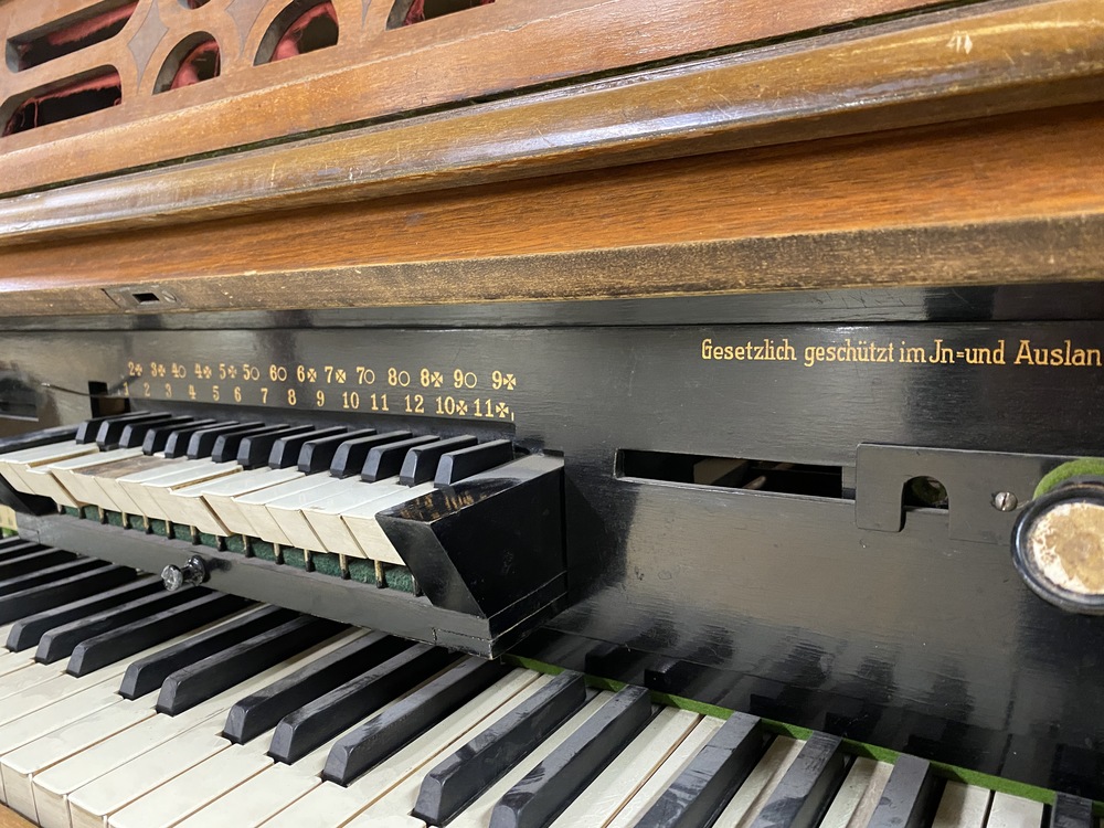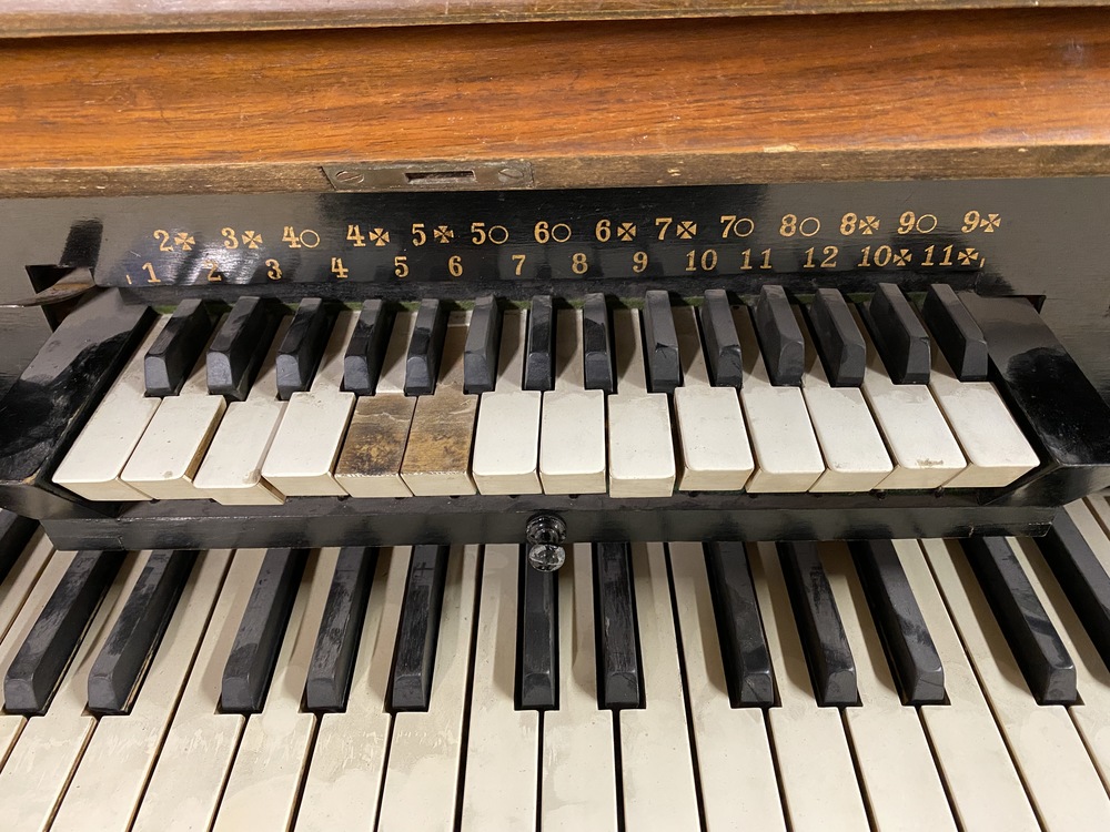 The small keyboard above the main keyboard is a mechanical chording device, which slides to side to select the key you are playing in. The gage below the stencil name shows the key that it is set to.