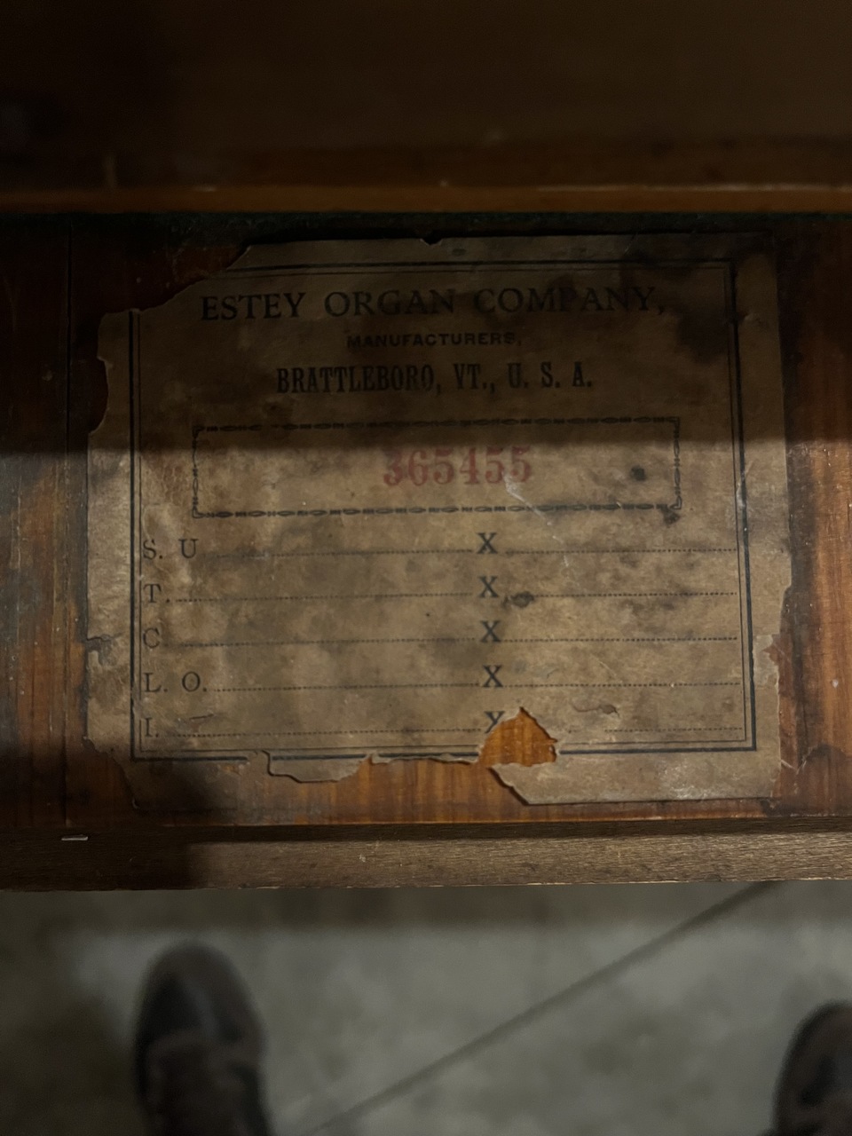 • Original “Estey Organ Co. Brattleboro, VT. U.S.A." decal replaced
