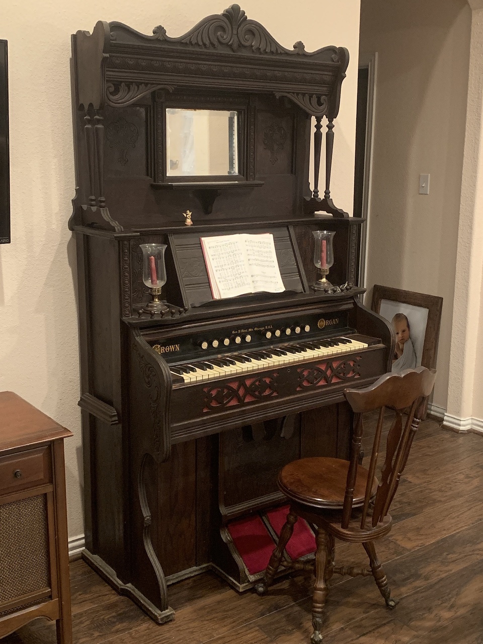The story of this organ goes back 5 generations in my family. It was purchased from a wagon peddler for $25 and some chickens in Fairlie, Texas. I was told by my grandmother that at the time it was purchased her mother was 9 years old which would have been 1903. It was there in the parlor for several years until it was passed down to my great grandmother and moved to Commerce, Tx. From there it moved with the family to Mineola, TX until it was passed down to my grandmother and moved back to her house in Wolfe City, TX. She taught me how to play it and passed it down to me. It is now in my living room in Trenton, Texas. It is a beautiful organ and plays very well.