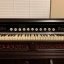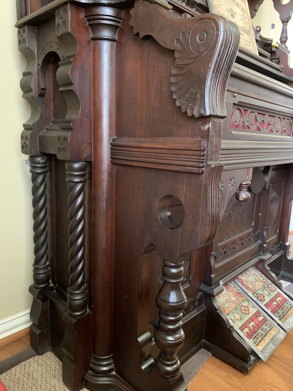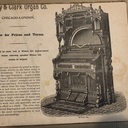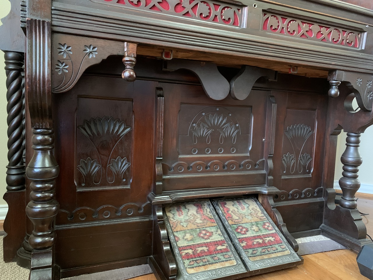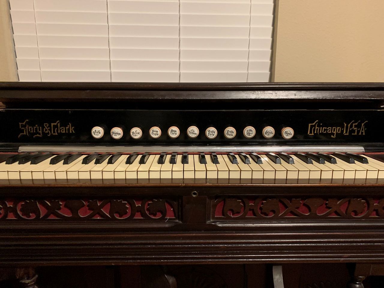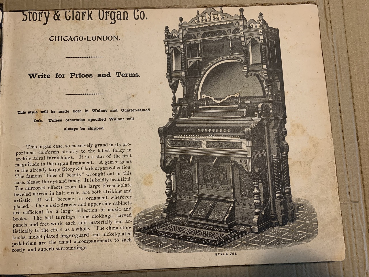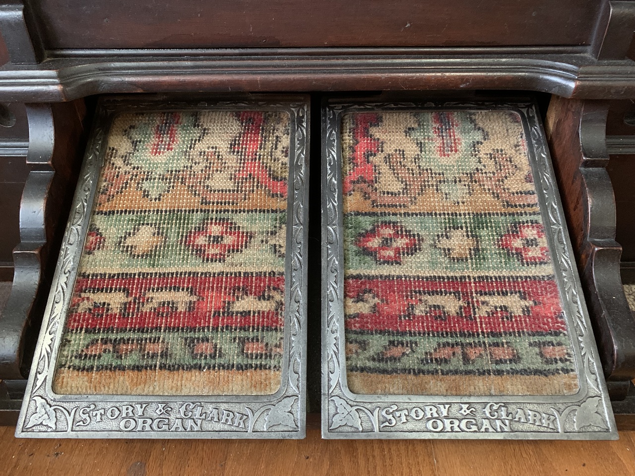 I have named this the Alice Robertson Glenn Organ. A fairly complete history / provenance is available from day of purchase at Sanger Bros in Dallas TX in the early 1890's, by the previous owner's great great grandfather Martin Glenn (b 1849, d 1930), for his wife Alice Robertson Glenn (b 1859, d 1913). Alice was a direct descendant of Col. Charles Robertson (roughly 1749 – 1806), who with his brother Gen. James Robertson (1742 – 1814) came down the Cumberland River from Virginia to settle in Tennessee. James went on to become known as the founder of Nashville. Martin Glenn was a wealthy banker and landowner; their son Oscar Glenn (b 1880, d 1962) was a doctor and a mayor of Seagoville TX. While the organ does not currently play (needs new bellows), it is in terrific shape - key action and pedals are tight. The left knee lever swings loose but the right lever is tight. The date is an estimate, based on other ROS database entries for Story & Clark.
