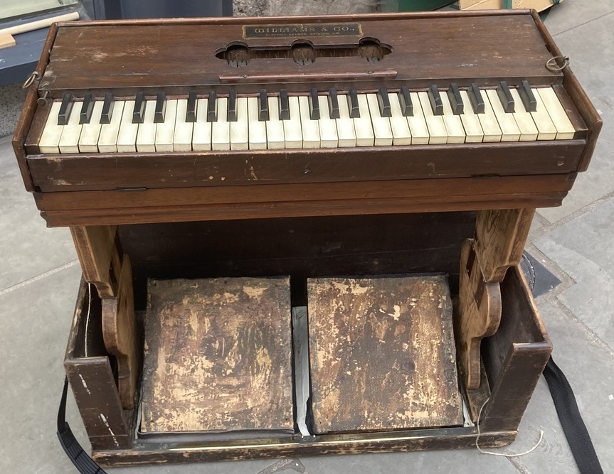The instrument is a simple folding harmonium with one rank of reeds and no stops. The lid is hinged and was originally operated by a spring ratchet system that allowed it to be raised and lowered by means of a metal knob to the left of the keyboard. However, this system is no longer operational.