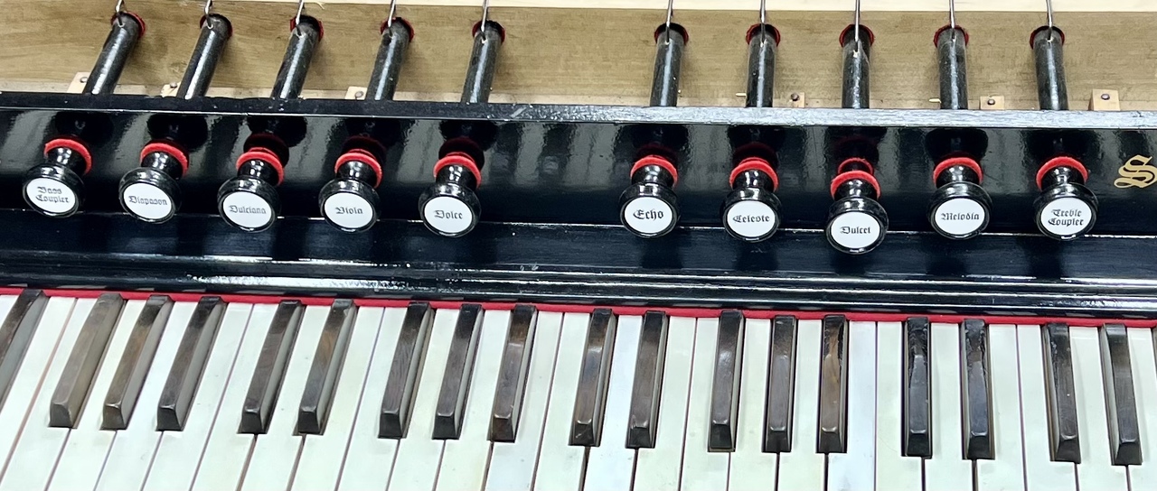 Serial number obscured and unreadable. February 2, 1906 date signed by factory tuner on back of keys.