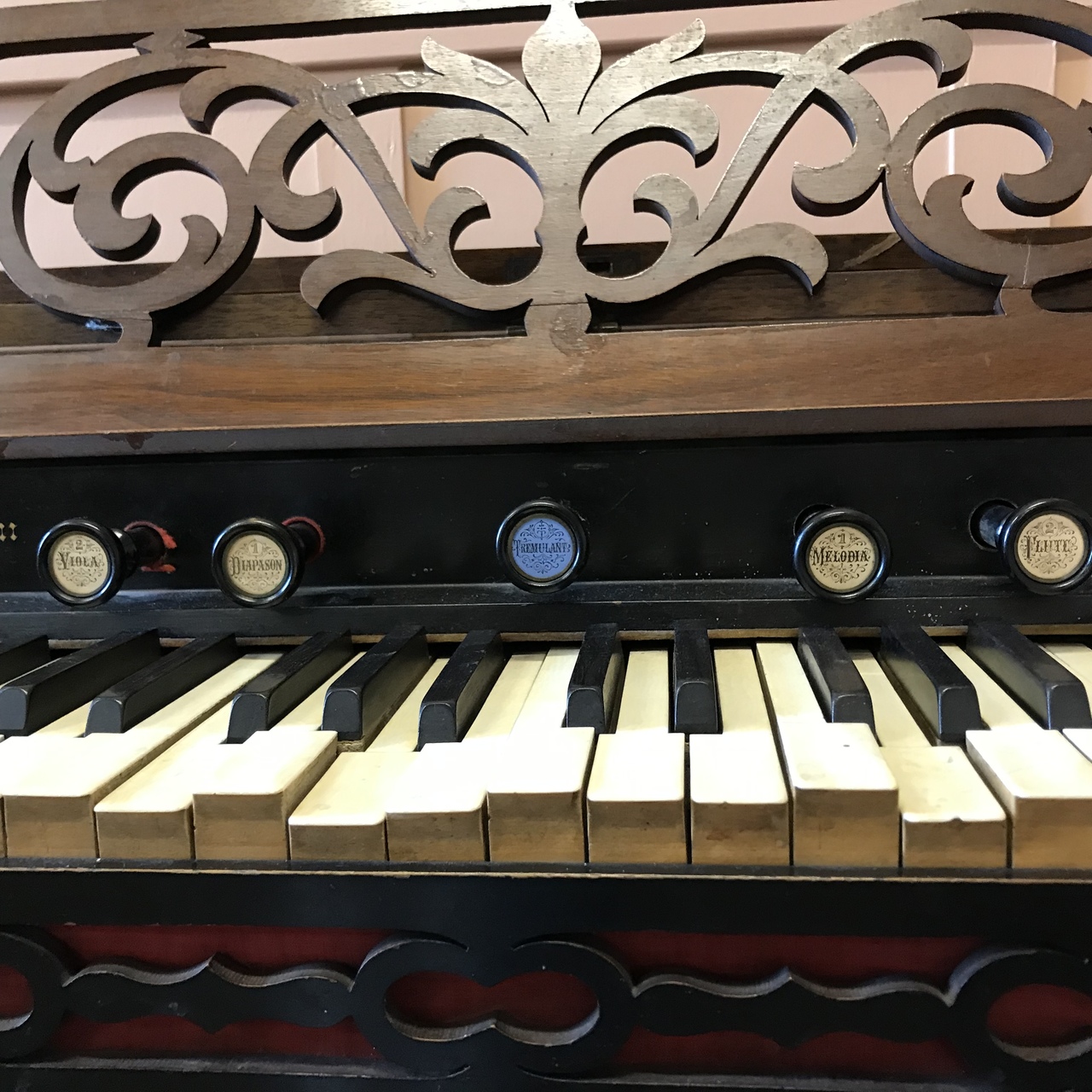Tremulant has blue background on stop whereas the others have white.; all appear to be original. It also has a single knee swell paddle. Date estimated from review of ROS database entries.