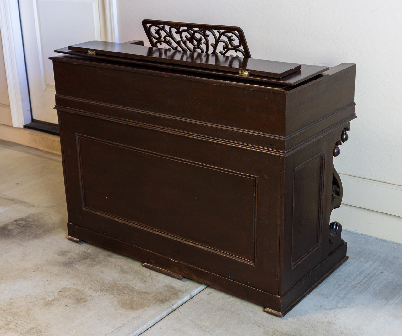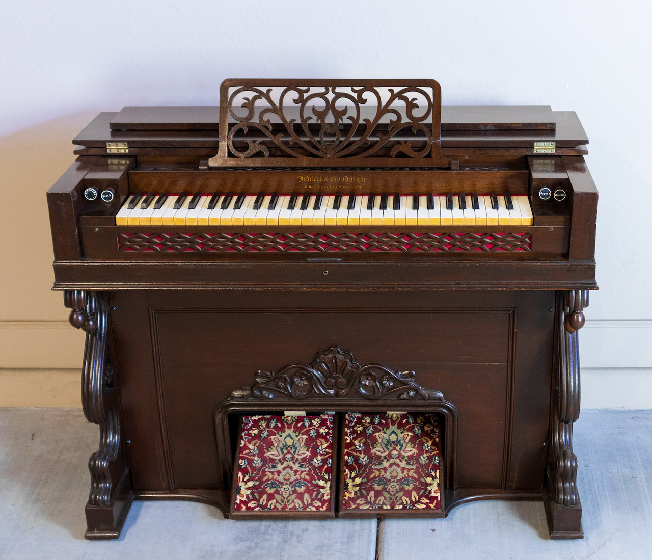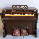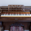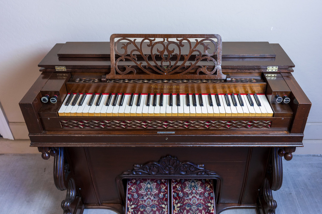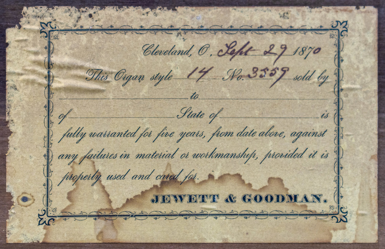 The paper label inside indicates this is a “Style 14” with the serial number and a manufacture date of Sept. 29, 1870. There are internal markings indicating cleaning and repairs in 1888, 1923, and 1924, so the organ was clearly in regular use at that time. This organ was purchased from an antique dealer in Mesa, AZ. The owner said he bought it at an auction along with several other items in Sun City, AZ that apparently came from some music museum. The organ was fully restored in the Spring of 2023. It is now on display at the Mohave Museum on old Route 66 in Kingman, AZ.