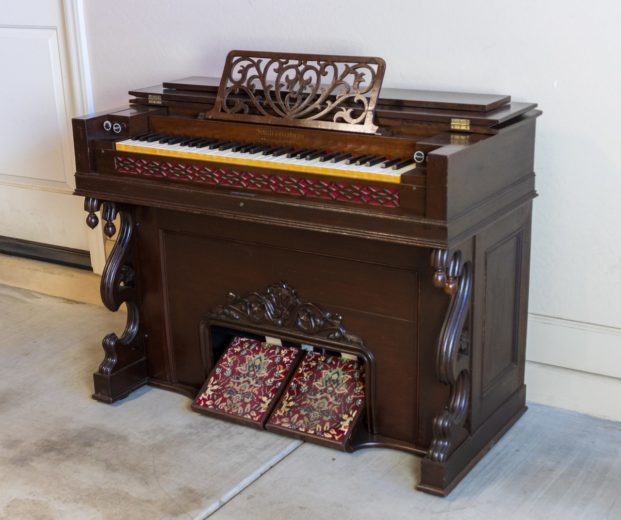 The paper label inside indicates this is a “Style 14” with the serial number and a manufacture date of Sept. 29, 1870. There are internal markings indicating cleaning and repairs in 1888, 1923, and 1924, so the organ was clearly in regular use at that time. This organ was purchased from an antique dealer in Mesa, AZ. The owner said he bought it at an auction along with several other items in Sun City, AZ that apparently came from some music museum. The organ was fully restored in the Spring of 2023. It is now on display at the Mohave Museum on old Route 66 in Kingman, AZ.