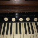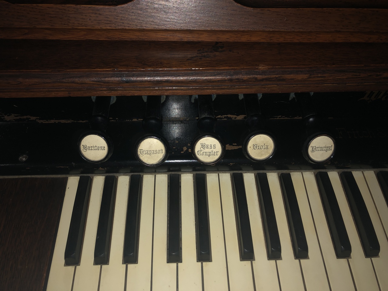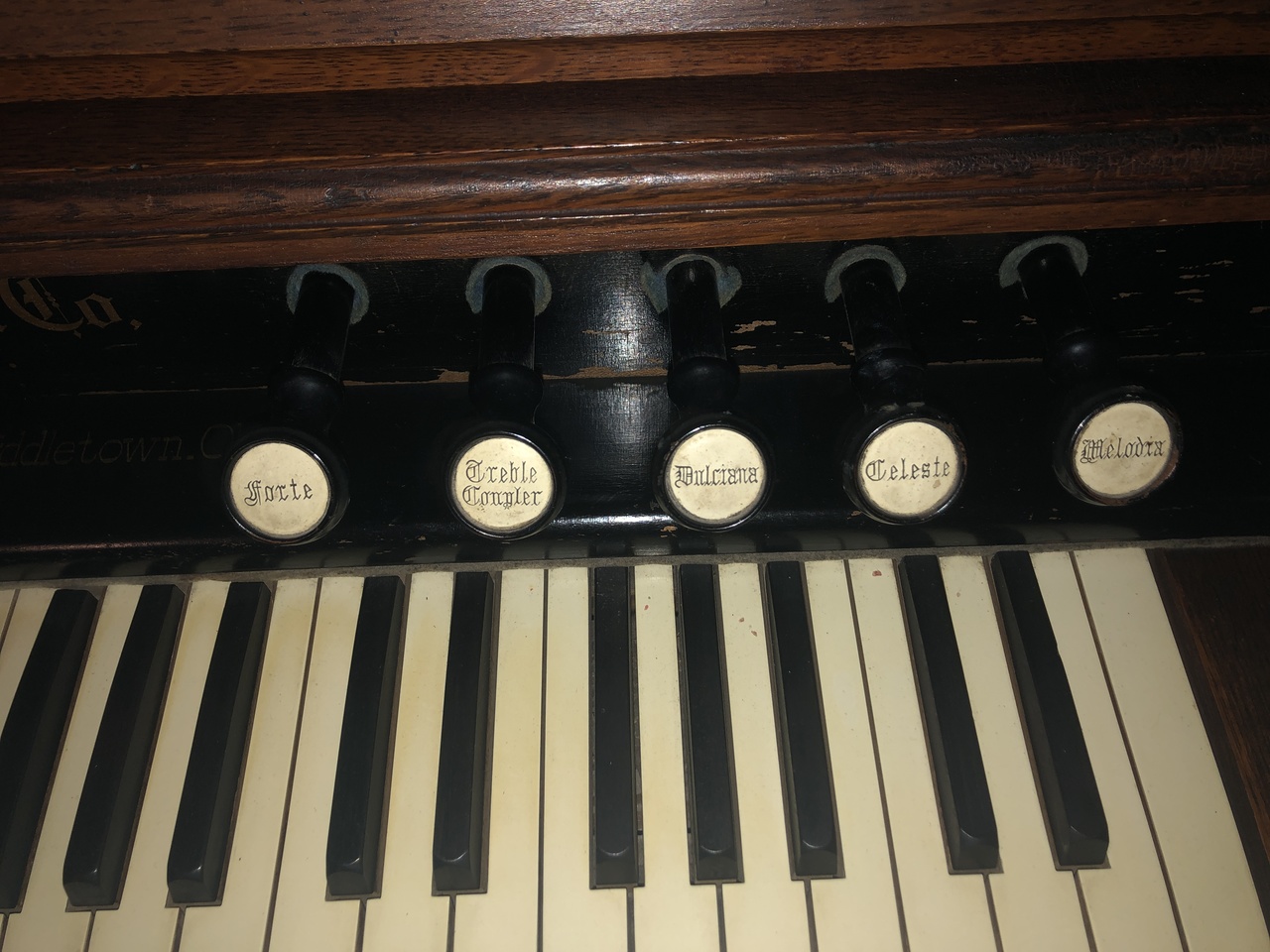 This organ was purchased used, for $40 in 1964 in Dayton, Ohio. The man we purchased it from said it was from a church, and they had removed the fancy top.