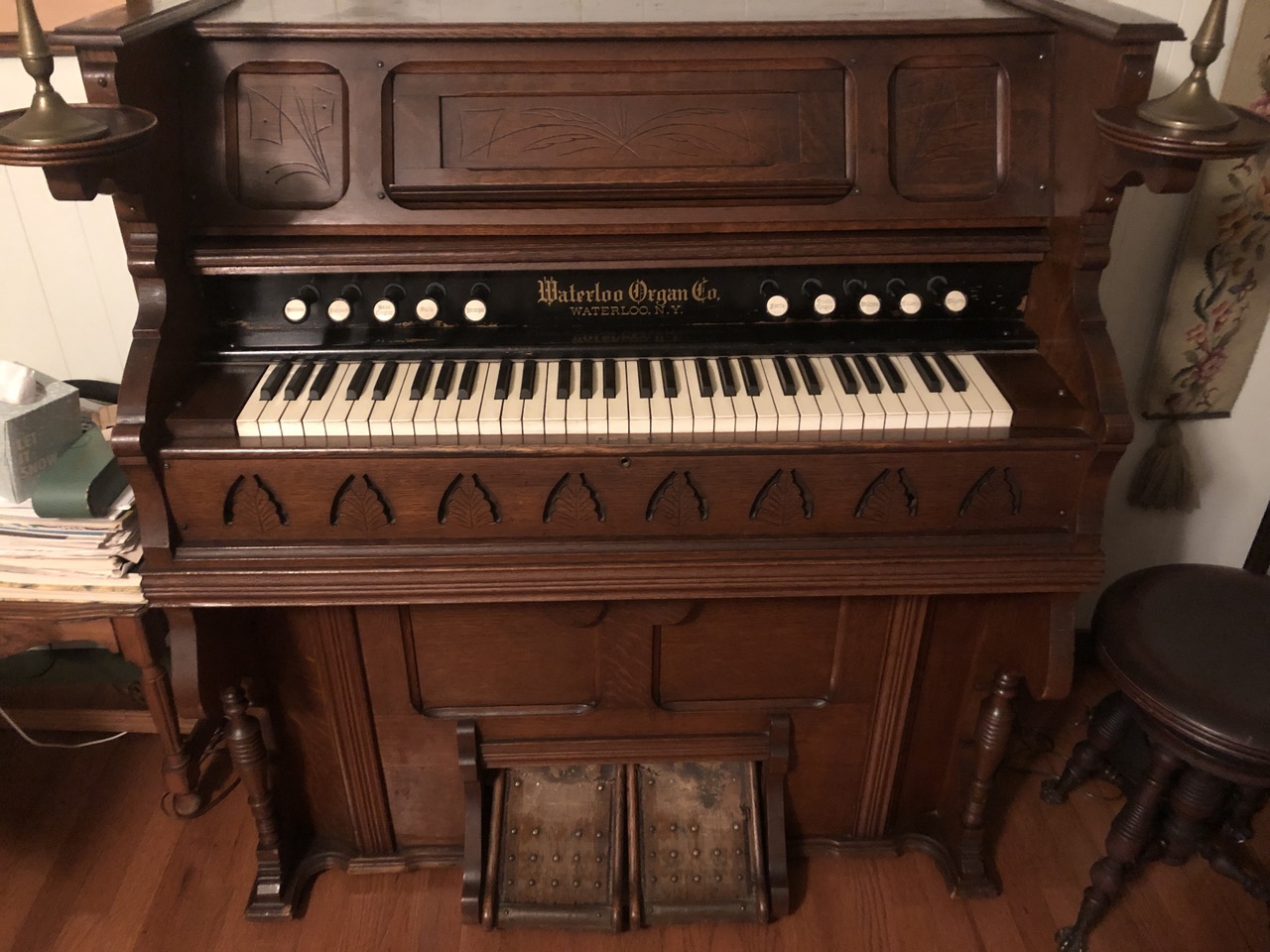 This organ was purchased used, for $40 in 1964 in Dayton, Ohio. The man we purchased it from said it was from a church, and they had removed the fancy top.