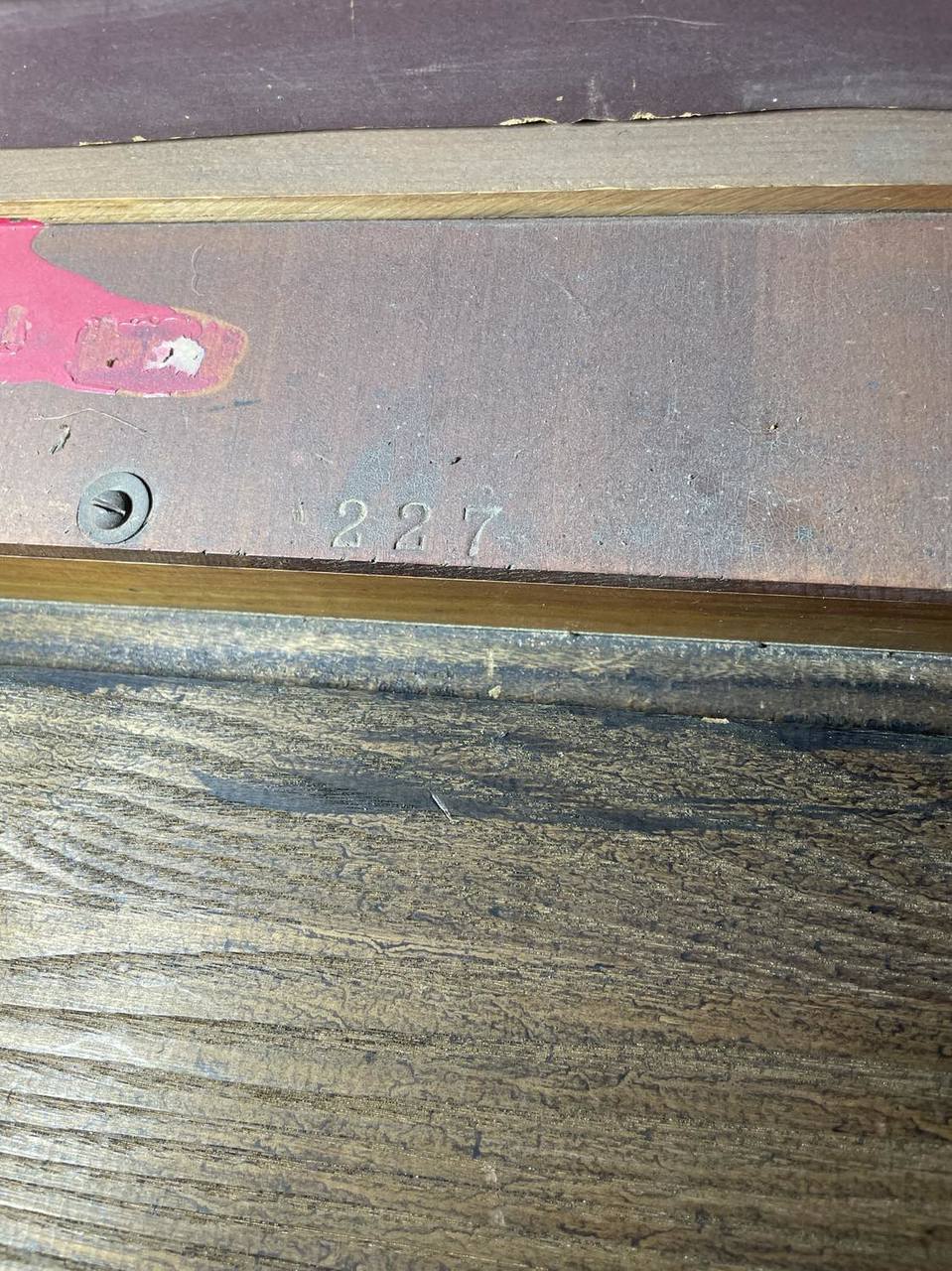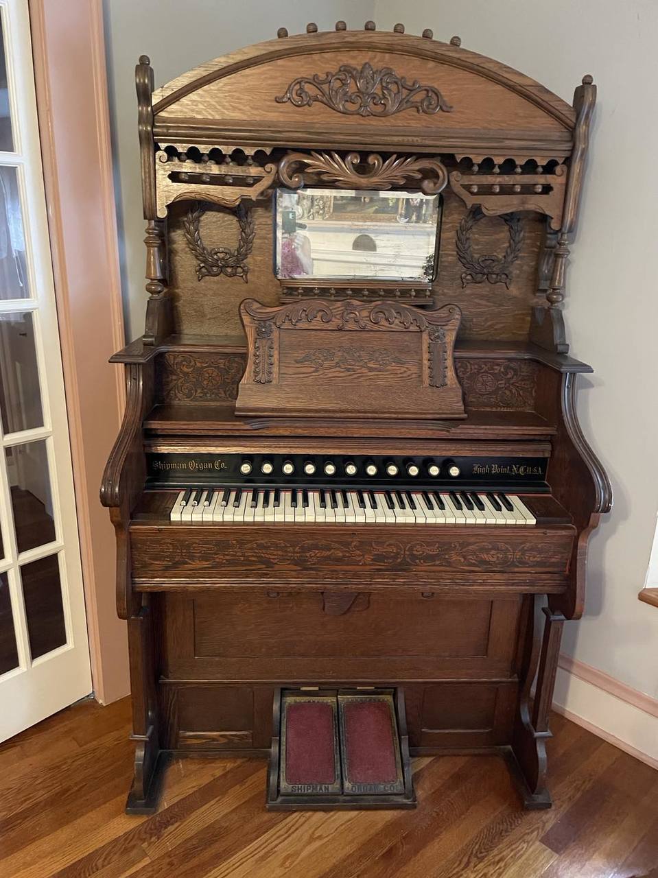The top of the organ is not the original. The organ was purchased by my father in 1967. The top was found at the Atlanta Flea Market during the 1970's. The manufacture date was found inside the back.
