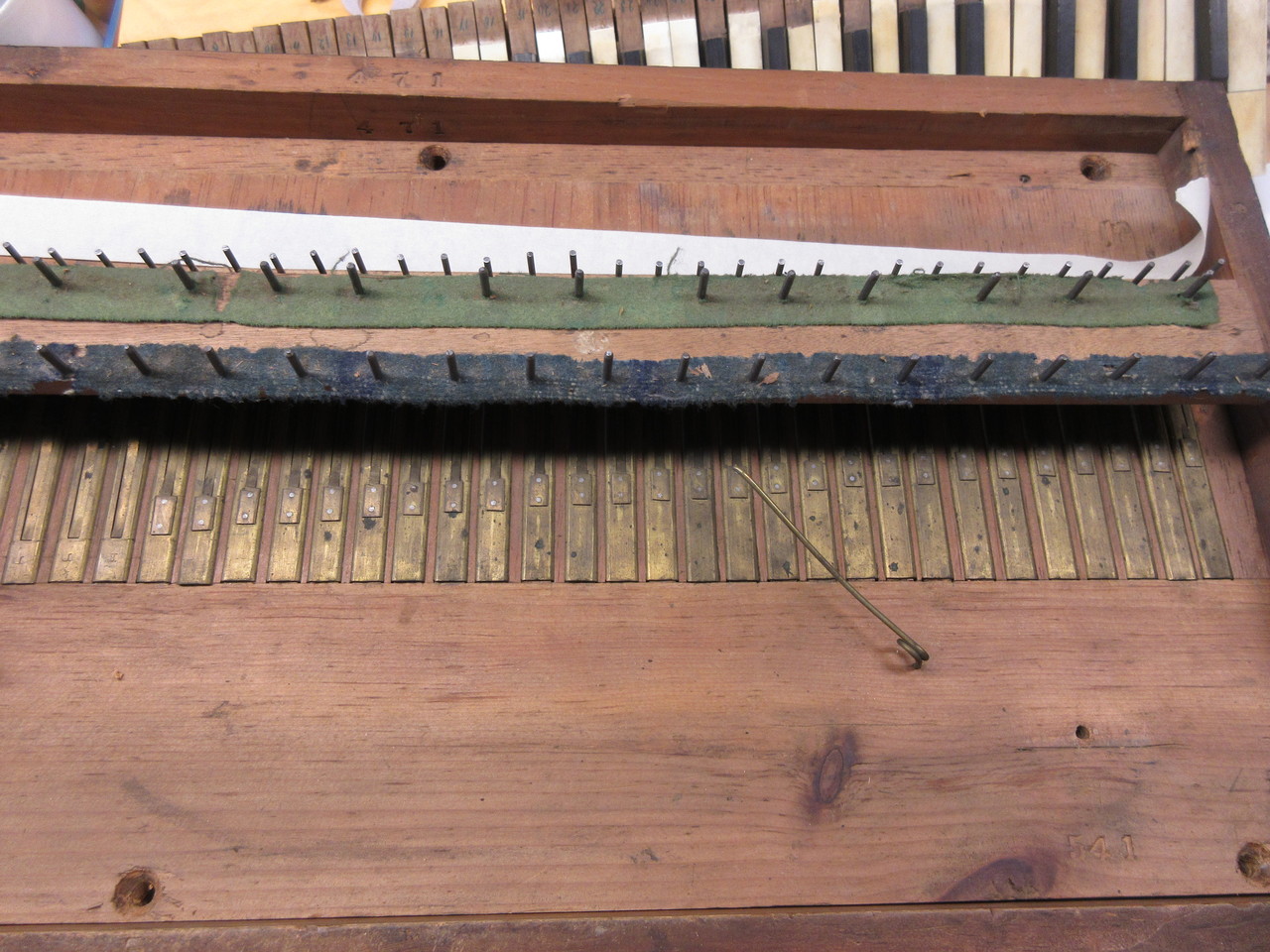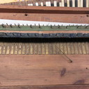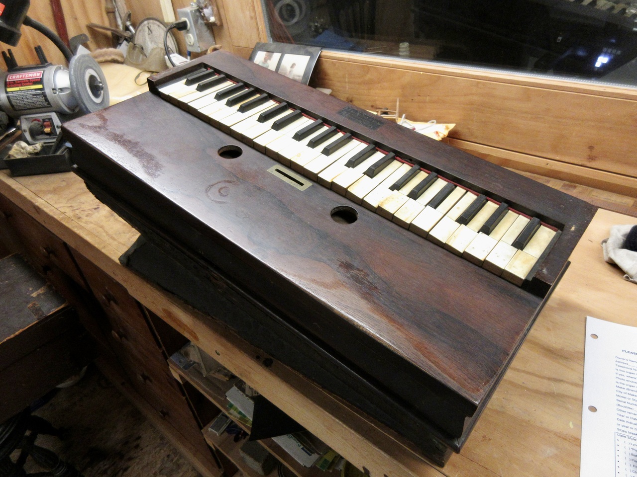 * Naturals are ivory tops with cherry fronts; sharps, ebony. There is a relief valve. Swell is a shutter held over the reeds on two springs that can be depressed to open the leading edge of the shade via a knob (missing) in the top. * Pitmans are steel rods. There is a single leaf spring in each bellows.