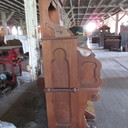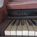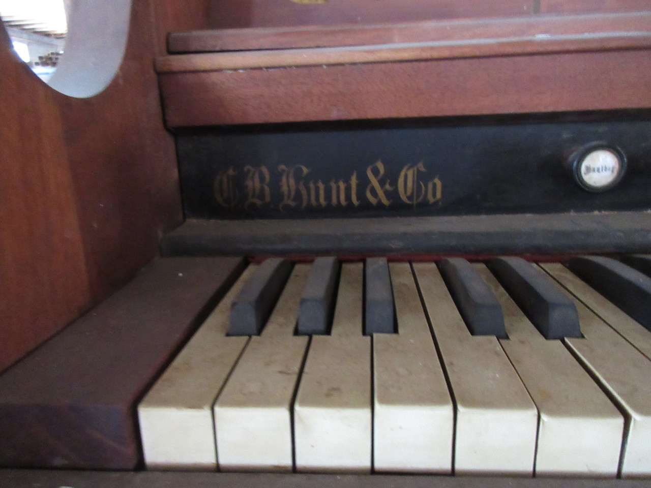 Right knee lever = swell; left knee lever = full organ. Ceramic stop faces; celluloid keys. Stop mechanism is very similar to New England Organ Co.: this is likely a stencil organ. Treadles are 7.5" x 10", wood-framed. No serial number found on action, but case and keyslip are stamped 38285. Pitch A446.