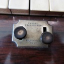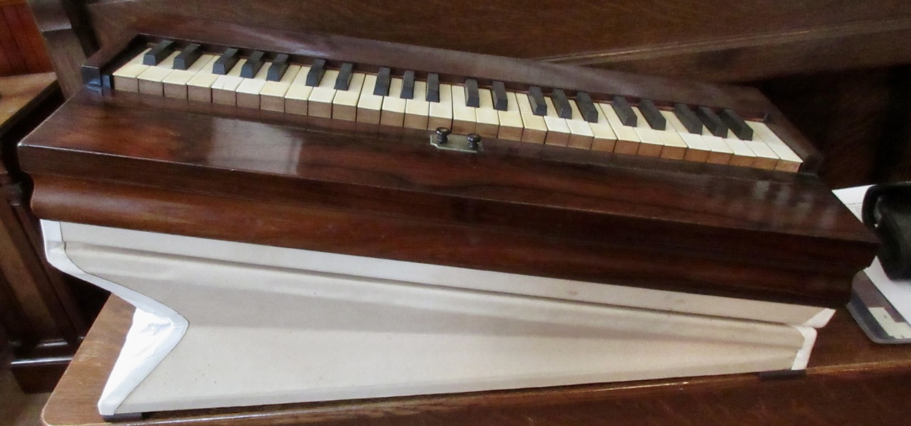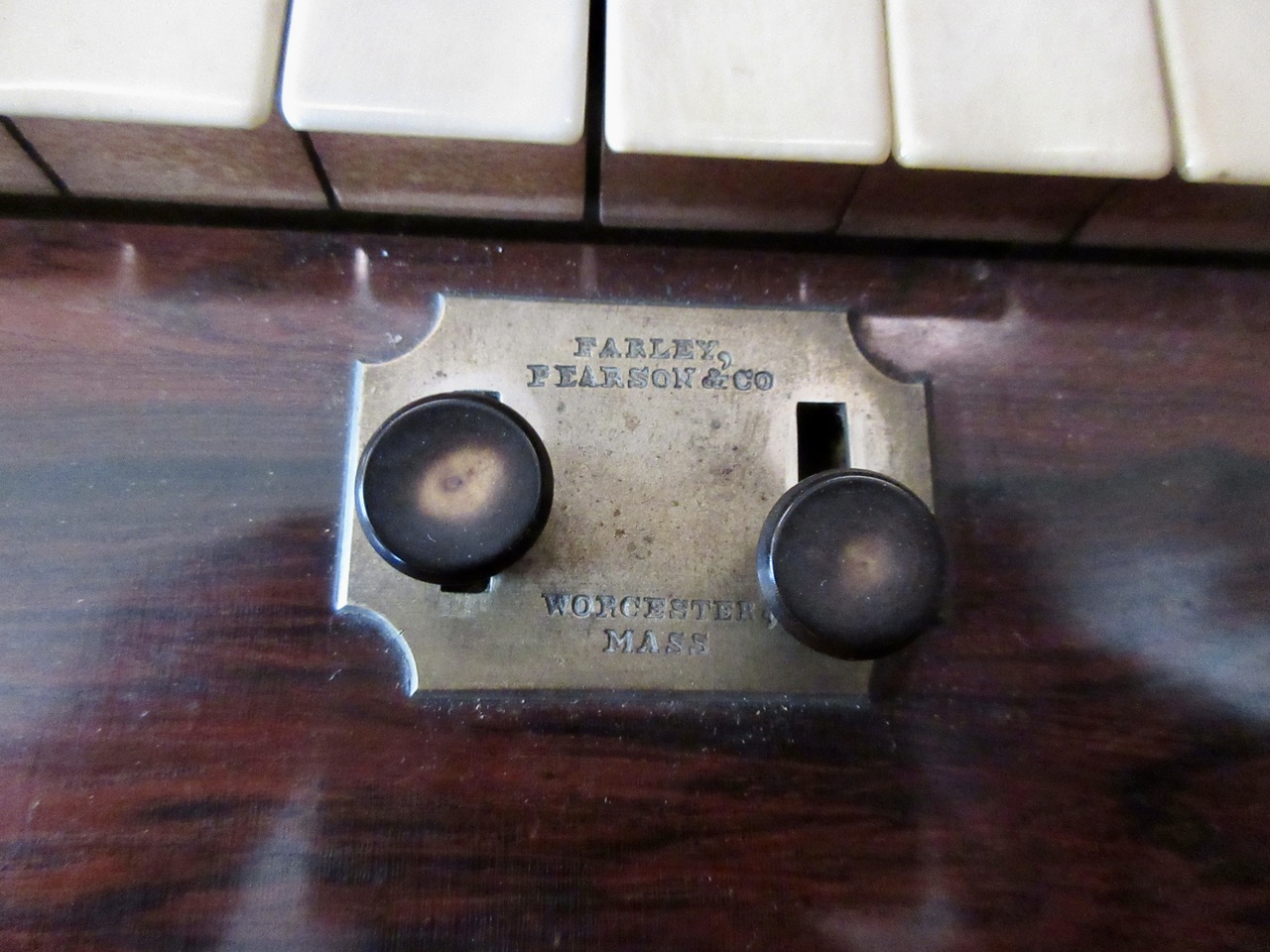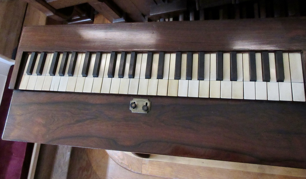 Date written in pencil under a stamped serial number. Also stamped on soundboard: "M. Morse, Tuner", and "J.G. Parsons". Ivory keys with square front edges, cherry risers. Two swell buttons: Right one operates full compass swell shade; Left one operates an internal damper. Reeds are channel-type. Pitch is A438.