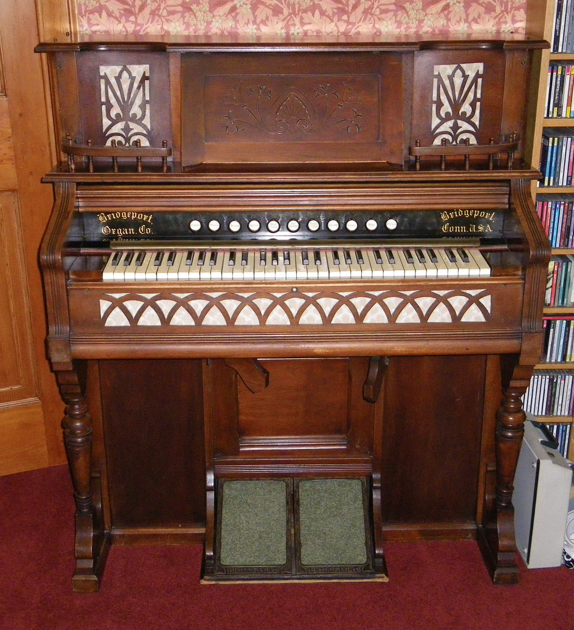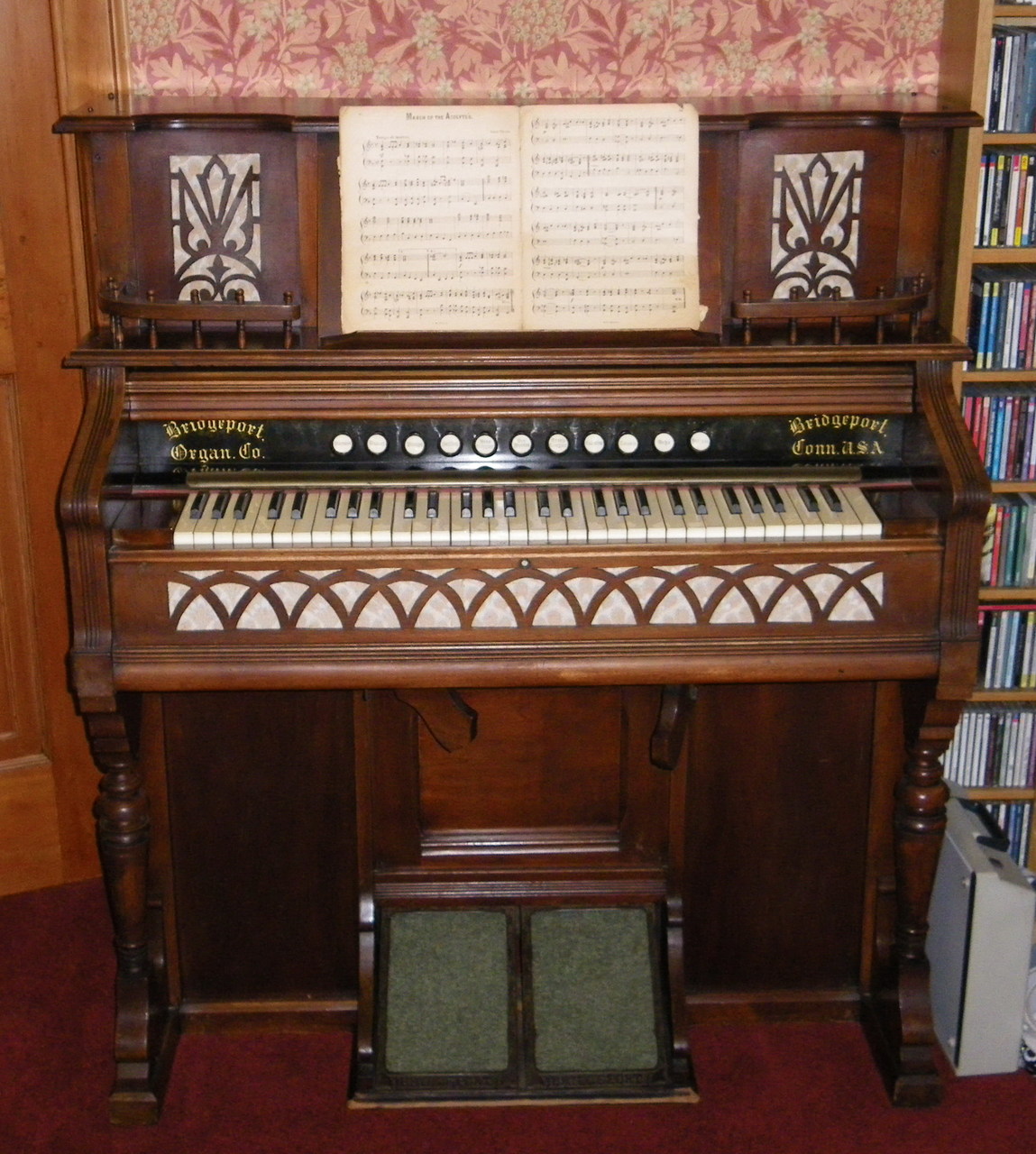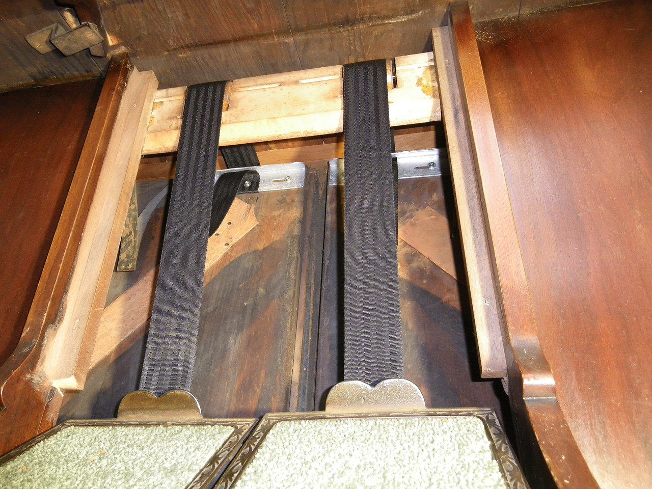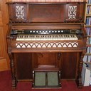 Believed to have been bought in the late 1890s by my great grandparents who lived near Leeds in the UK. It spent the first few decades in the North of England finally with a relative in Cumbria. In the 1960s it came to our family home in Coventry, and then to its final home in Scotland in the late 1970s. It has always worked, apart from one note in the Celeste/Celestina rank. In recent years the pumping action became very weak so it was barely playable. I've recently refurbished it, fitting new bellows straps and repairing a couple of small tears in the reservoir. The pumping now seems very good and will hold suction for some time after you stop pedalling. I don't think it has probably been cleaned before as the inside had plenty of black dust, probably the result of living in a coal mining and weaving town.
