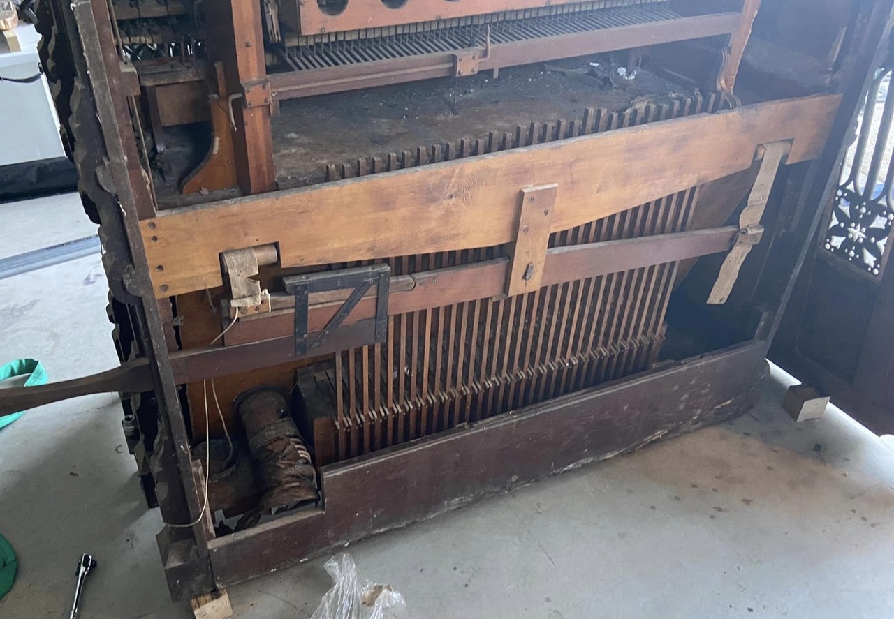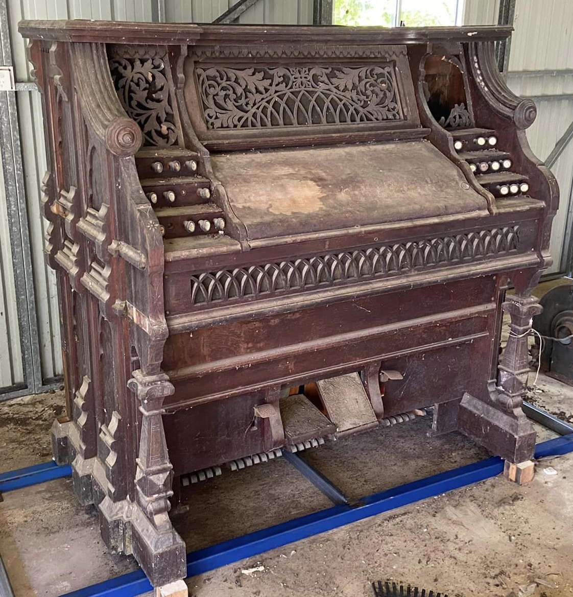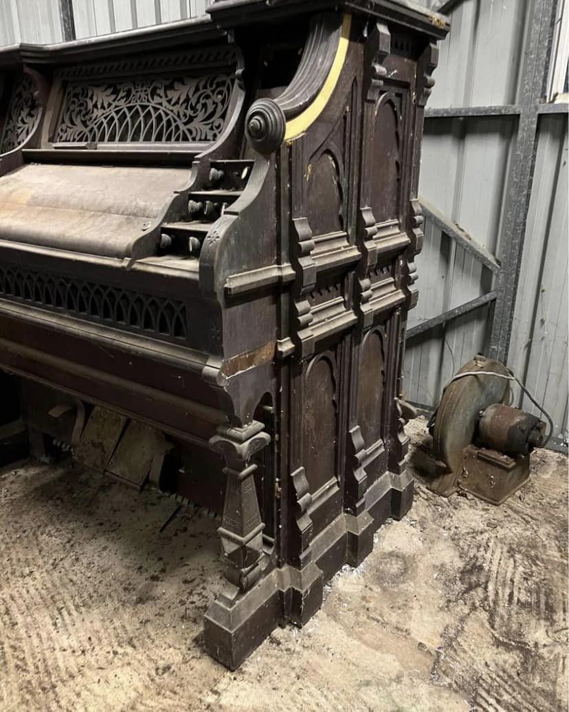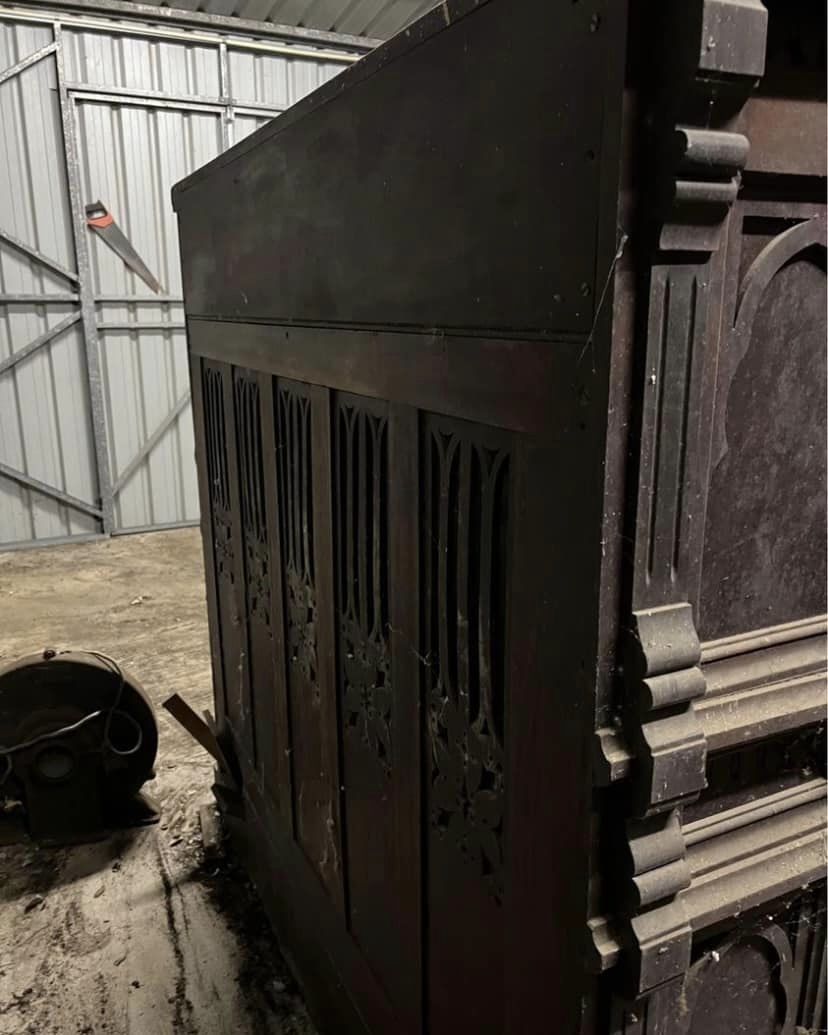 Project taken over from Ethan Troy. Organ originally from a Brisbane, Australia Church. Stored for 50 years under a house. Faux pipe organ top is missing to history (going to be a fun job to recreate that from pictures). Currently in a crusty, as found state while I gather information on restoration.