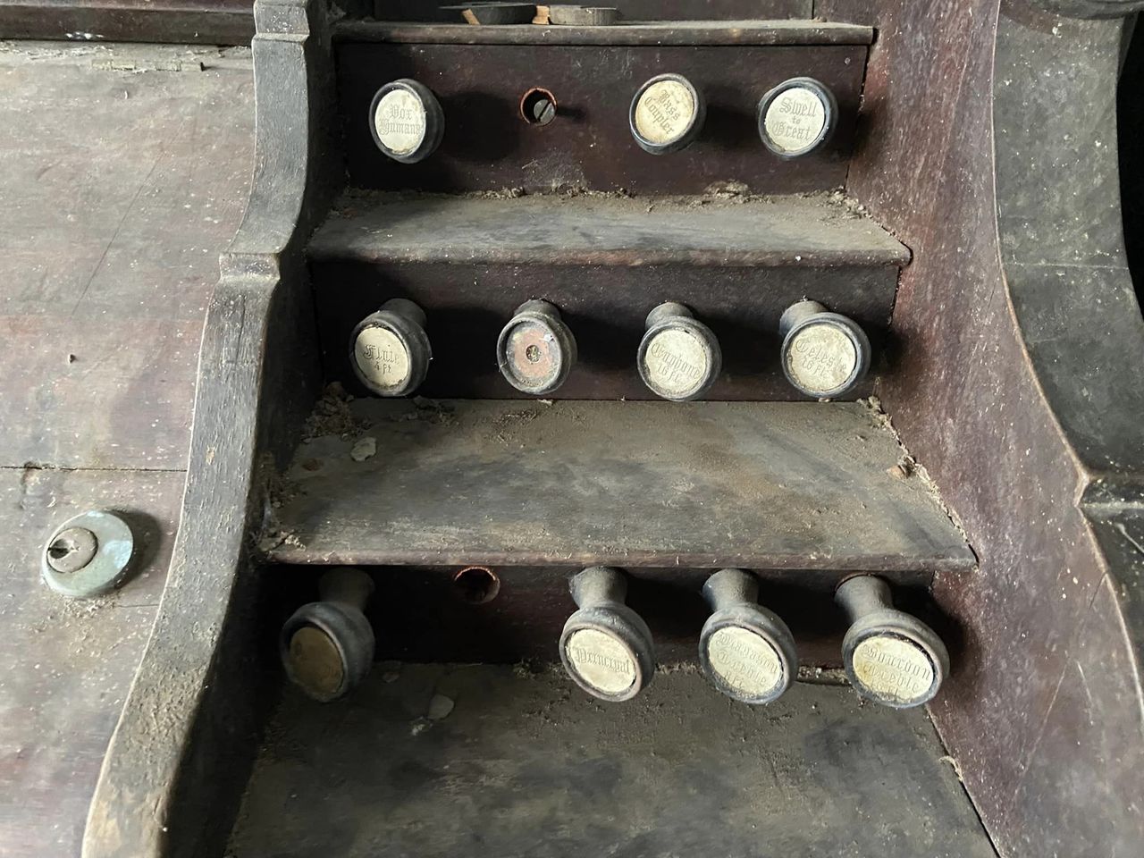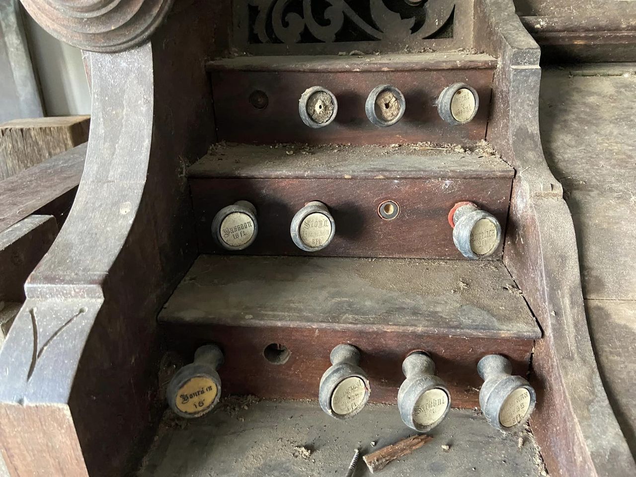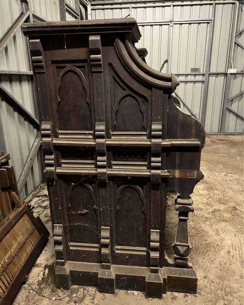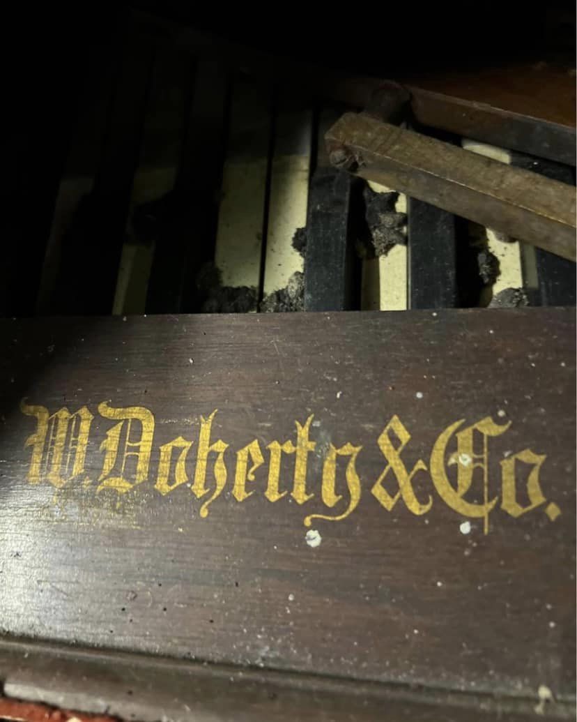 Project taken over from Ethan Troy. Organ originally from a Brisbane, Australia Church. Stored for 50 years under a house. Faux pipe organ top is missing to history (going to be a fun job to recreate that from pictures). Currently in a crusty, as found state while I gather information on restoration.
