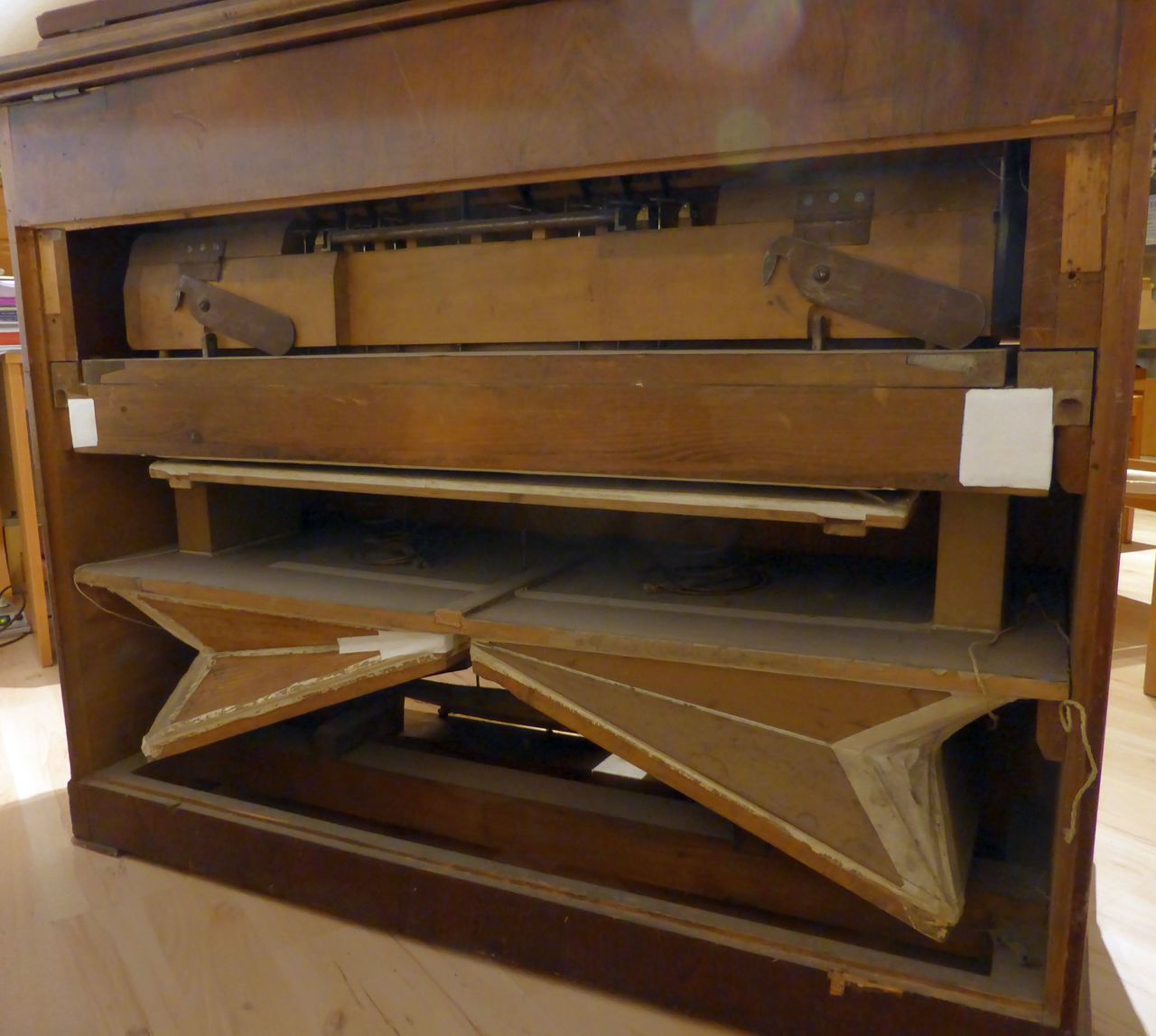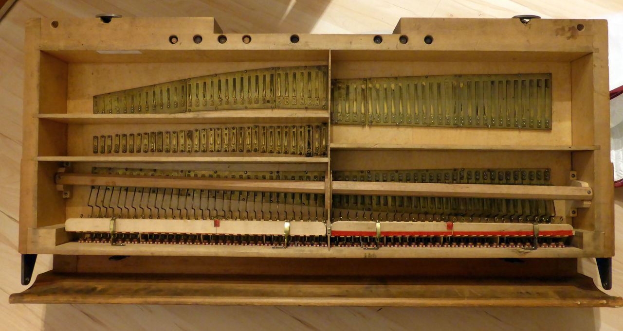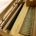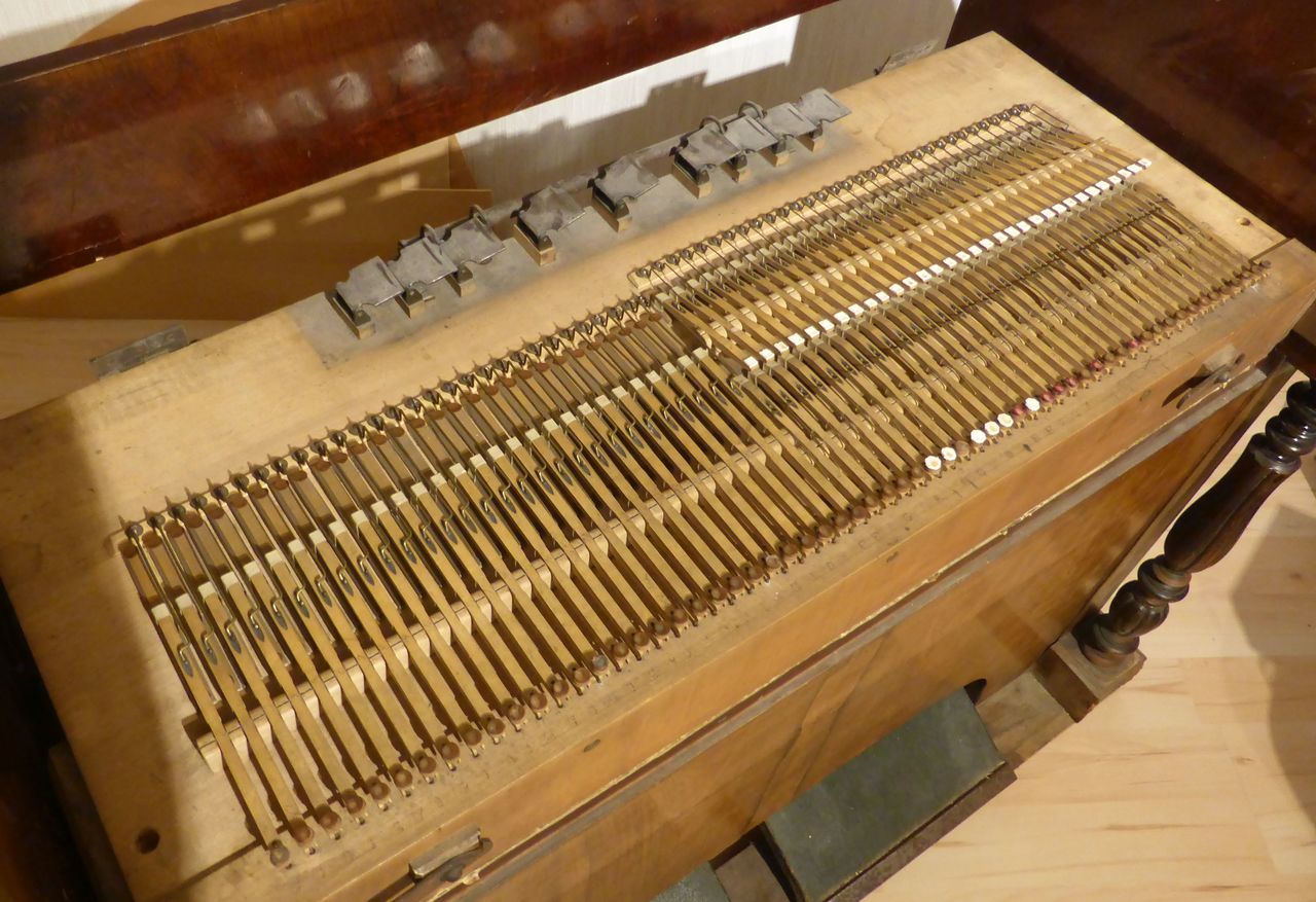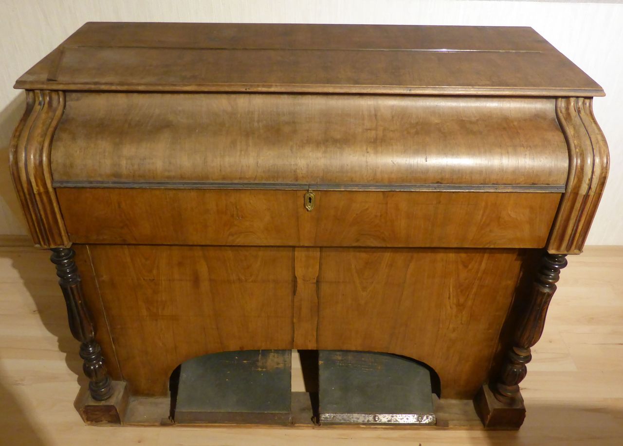 In Austria, the instrument was standing in an attic with the windchest open and not screwed down, where it suffered water damage. Brought to the Black Forest in the early 2000s. The valve plate of the windchest had cracked open lengthwise due to moisture and was reglued by the organ builder. The exterior was very weathered, a new coat of shellac was started at home but not completed. The wind system was sealed with lamb leather. The hammers of the percussion action and the stop action are not optimally adjusted. Estimated to be from the 1870s era, during 1868-1878, Peter Titz produced under the label 'Kaiserl. Königl. Hof'. Pitch is A438.
