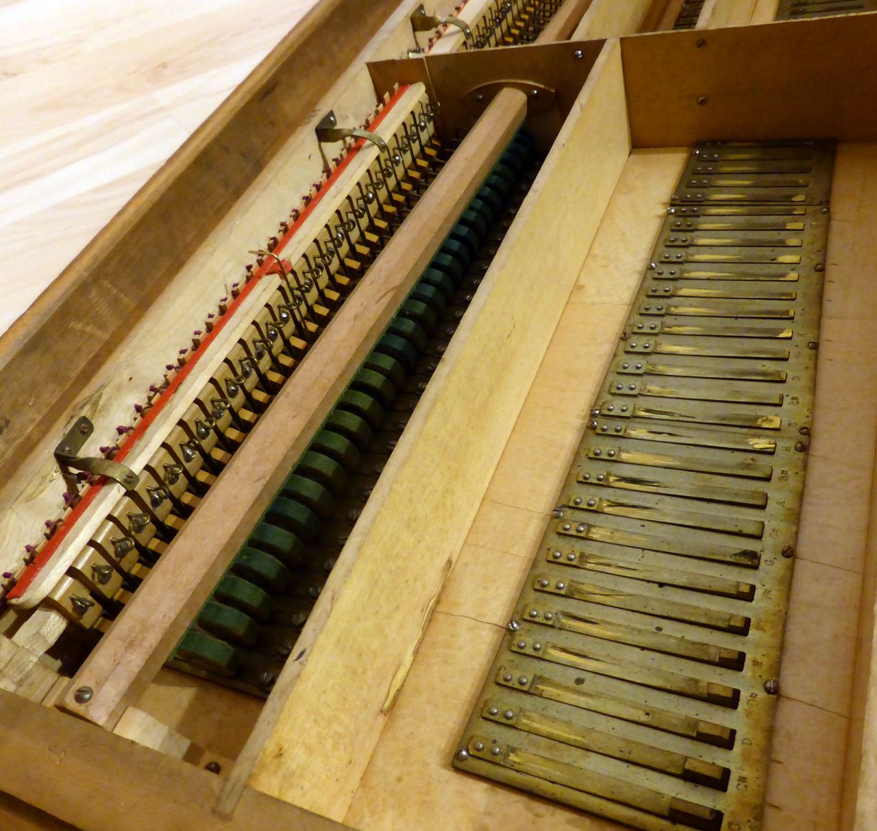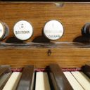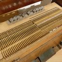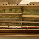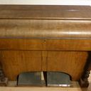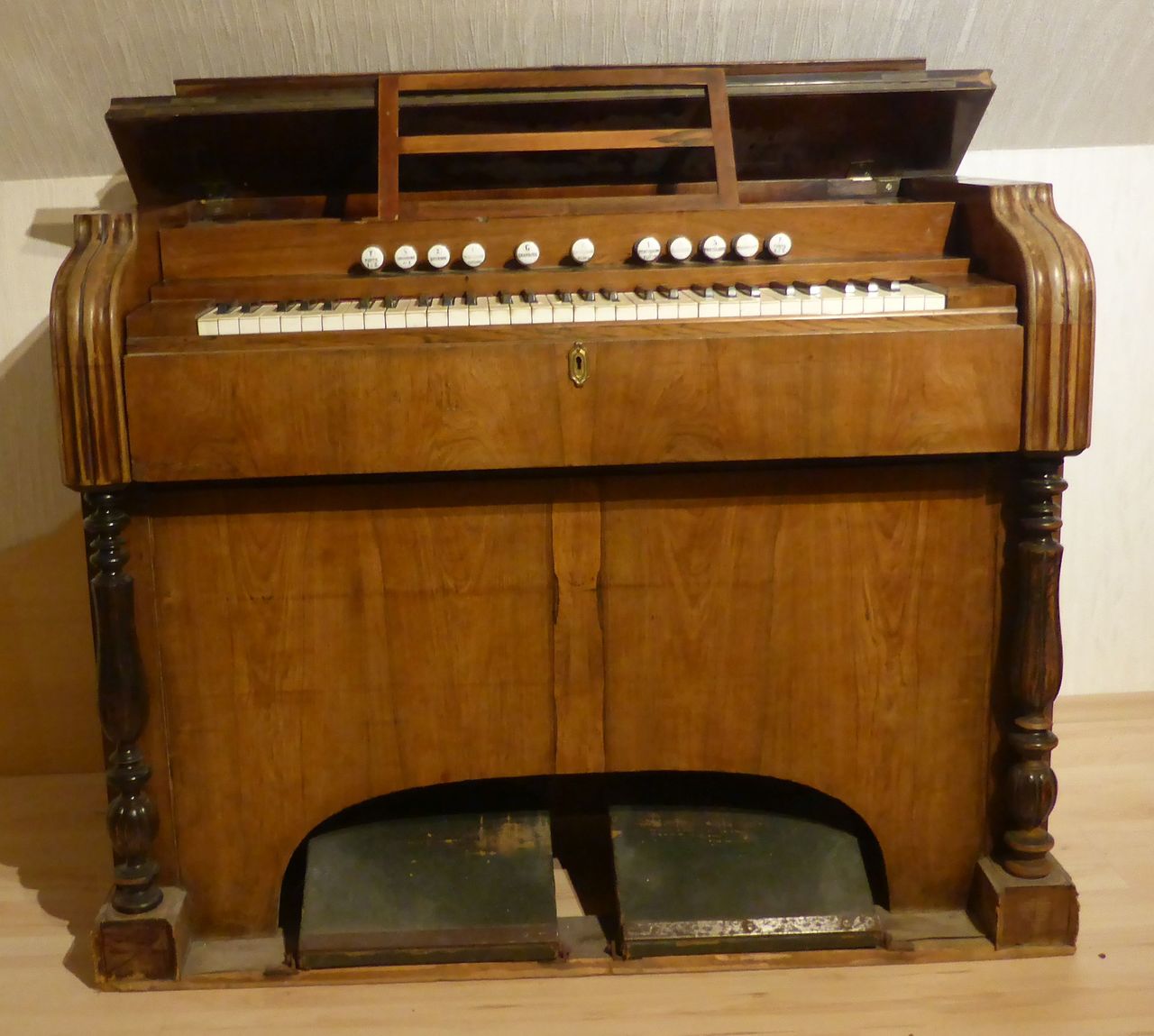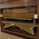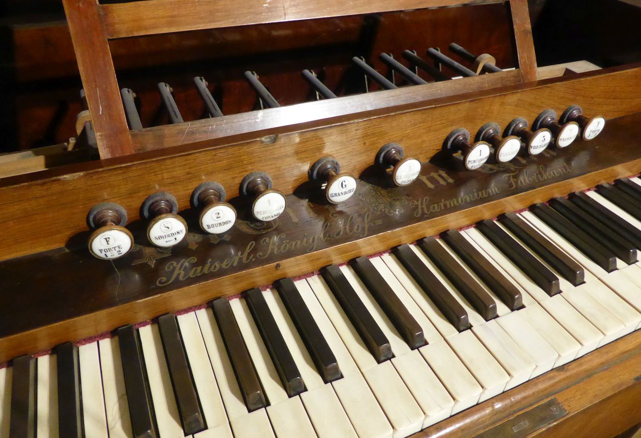 In Austria, the instrument was standing in an attic with the windchest open and not screwed down, where it suffered water damage. Brought to the Black Forest in the early 2000s. The valve plate of the windchest had cracked open lengthwise due to moisture and was reglued by the organ builder. The exterior was very weathered, a new coat of shellac was started at home but not completed. The wind system was sealed with lamb leather. The hammers of the percussion action and the stop action are not optimally adjusted. Estimated to be from the 1870s era, during 1868-1878, Peter Titz produced under the label 'Kaiserl. Königl. Hof'. Pitch is A438.