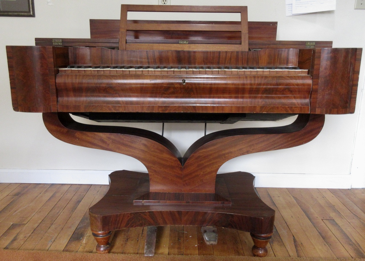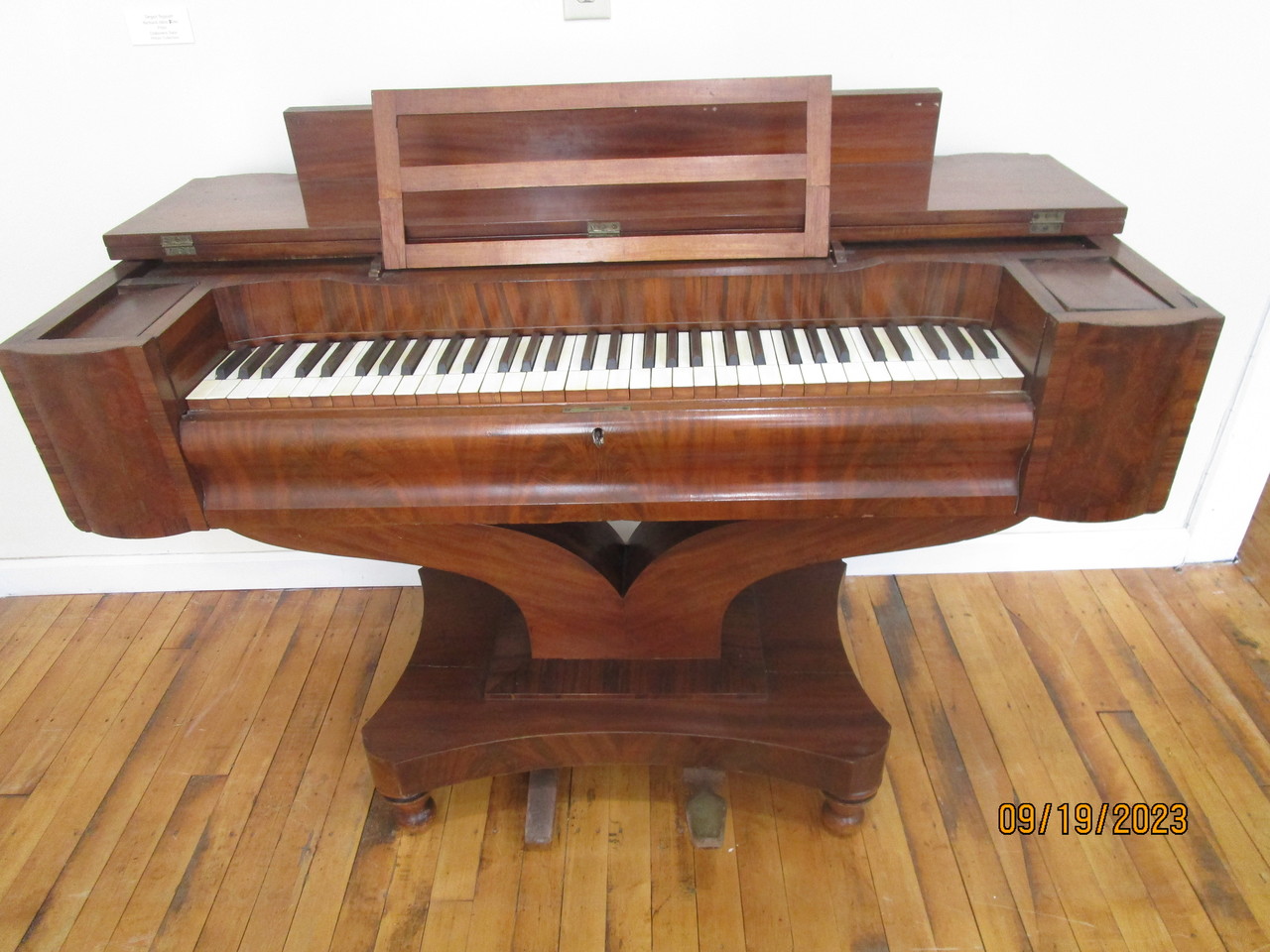 This is the same organ registered as ROS Database #G402. Manchester Historical Society Catalog #2023.49; obtained from the Stearns Collection of Musical Instruments, University of Michigan; previously in the Keith Heiss Collection, Michigan. Right treadle: wind; left treadle = swell--there are three swell shades, the operation of each of which is unclear. Channel reeds, some vertical. Ivory key-covers; cherry fronts; ebony sharps. Pitch is A432.