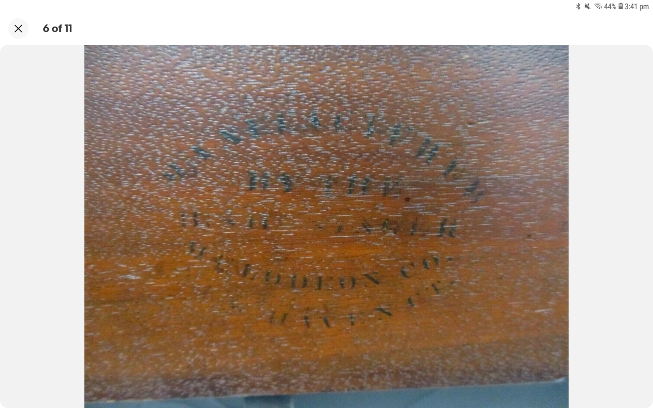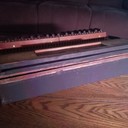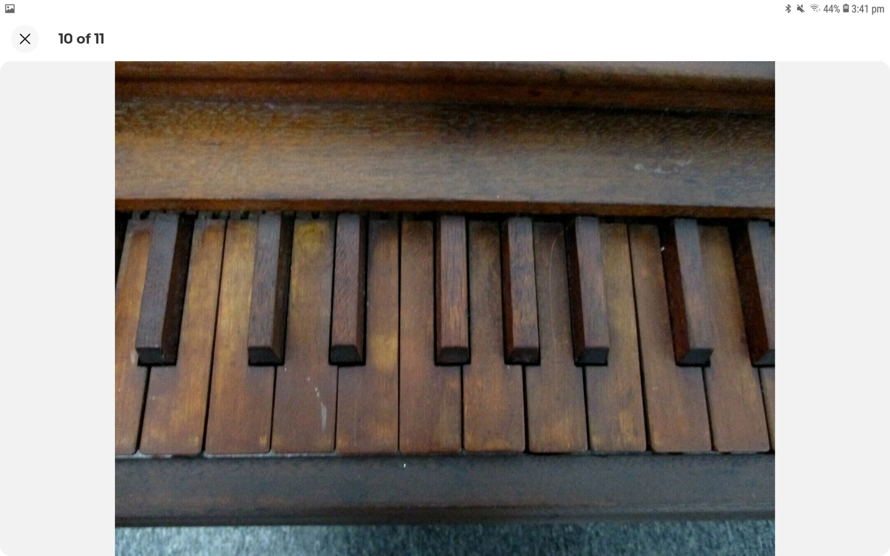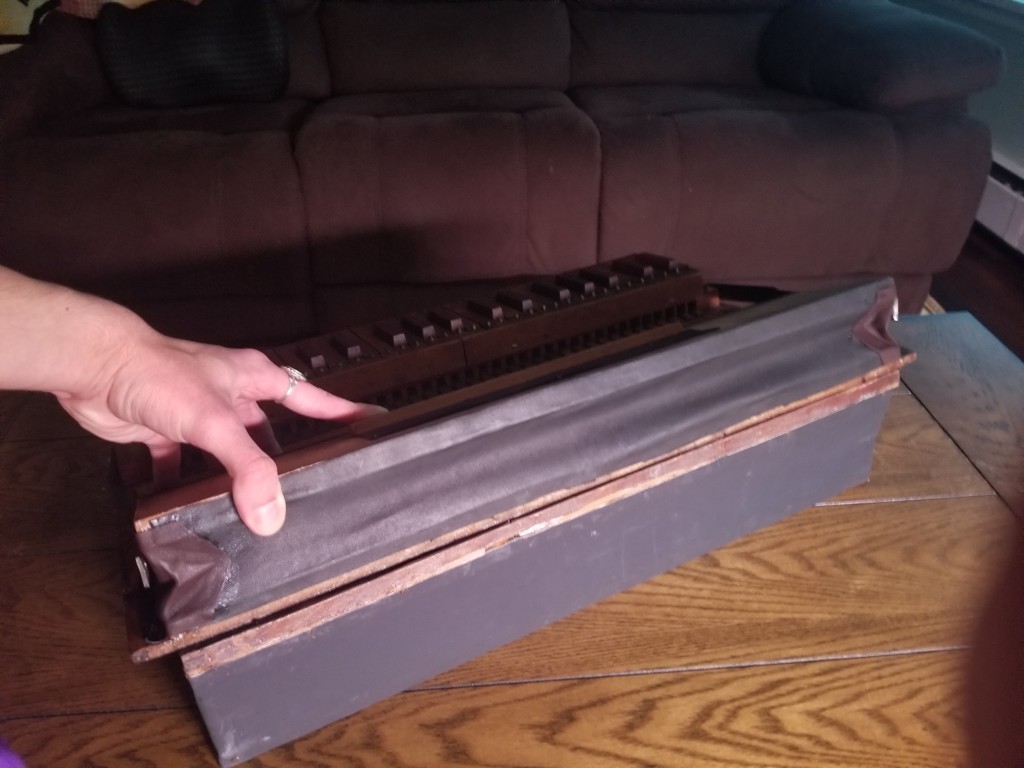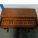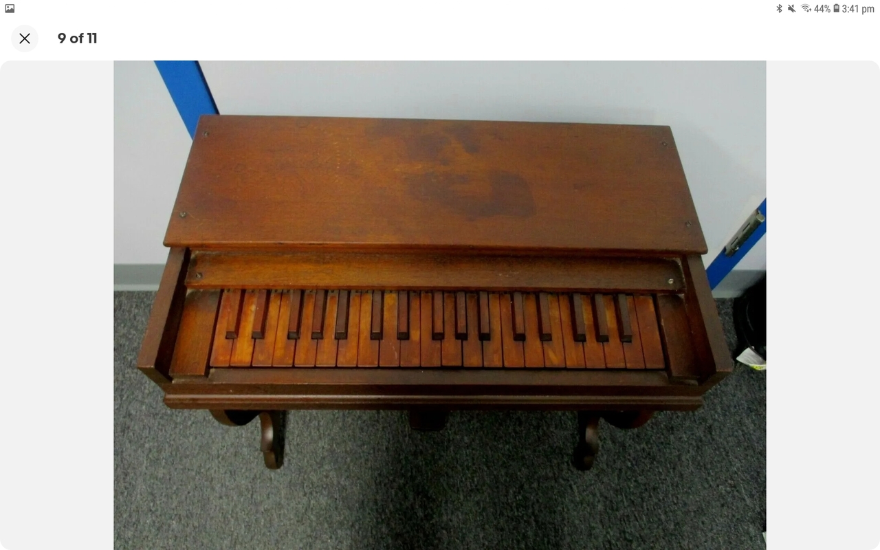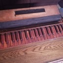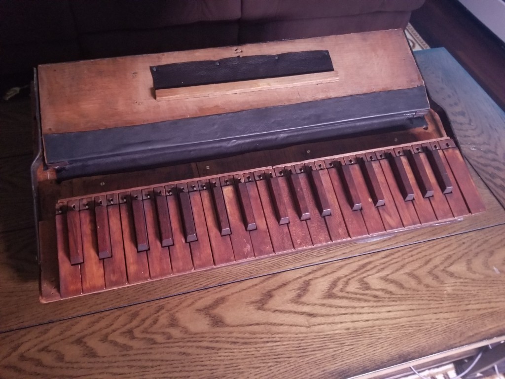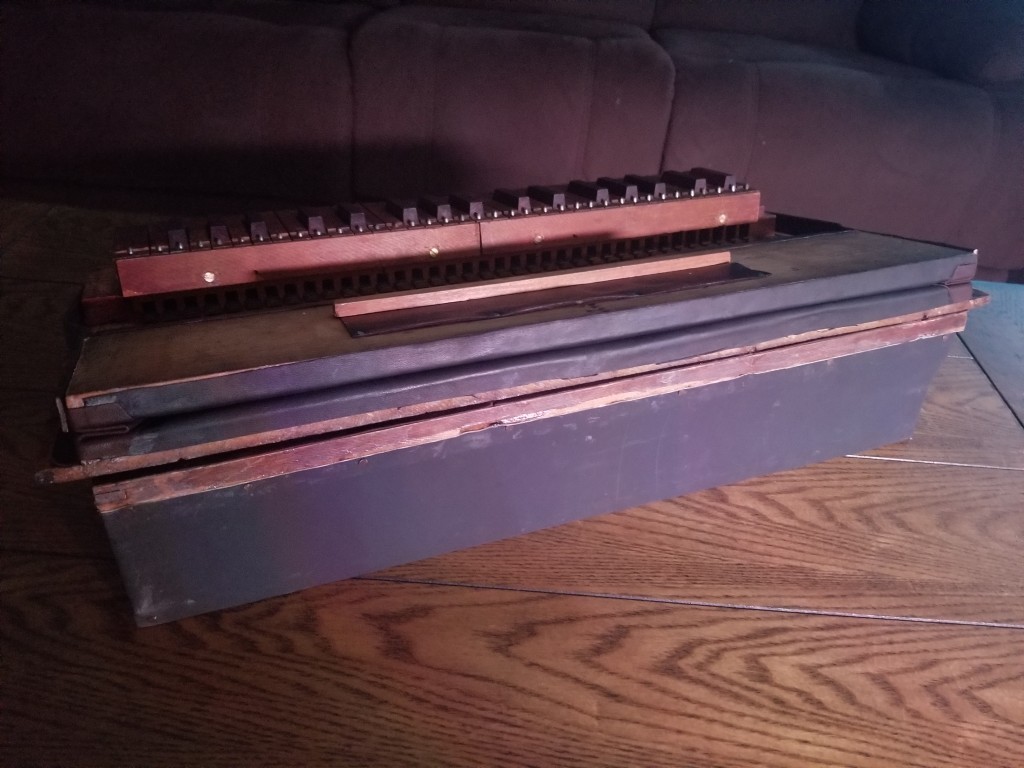 B. Shoninger Melodeon Co. Seems to be excessively rare. Was purchased online from a man whose wife's family has owned it for over 100 years. Currently in disrepair; everything is there, though. Bellows need redone and pallets need some attention. Reeds are typical melodeon style reeds and the legs fold. Keys are currently all depressed as pallet spring is not stable and needs to be reinforced. Will hopefully be successfully restored and a reliable travel instrument. Not neglected, just forgotten. Probably stored in an attic or the like. Child's or Salesman's Sample. Estimated to be 1850s or 1860s based on the reeds and other similar instruments.