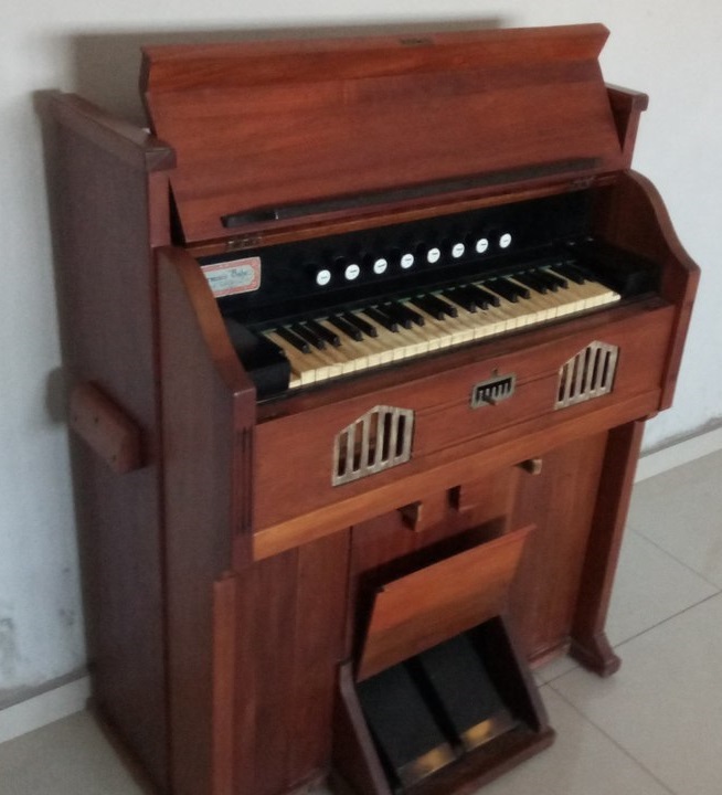 This reed organ is constructed in Brazil in the early 50's (1950 marked inside with pencil), has ivory keys with a transpose (ho moves the keys for left or right direction) have a red wooden from cherry tree and is in the past owned by a Presbyterian church from Santo André, then it was restored by a previous owner and then sold to me.