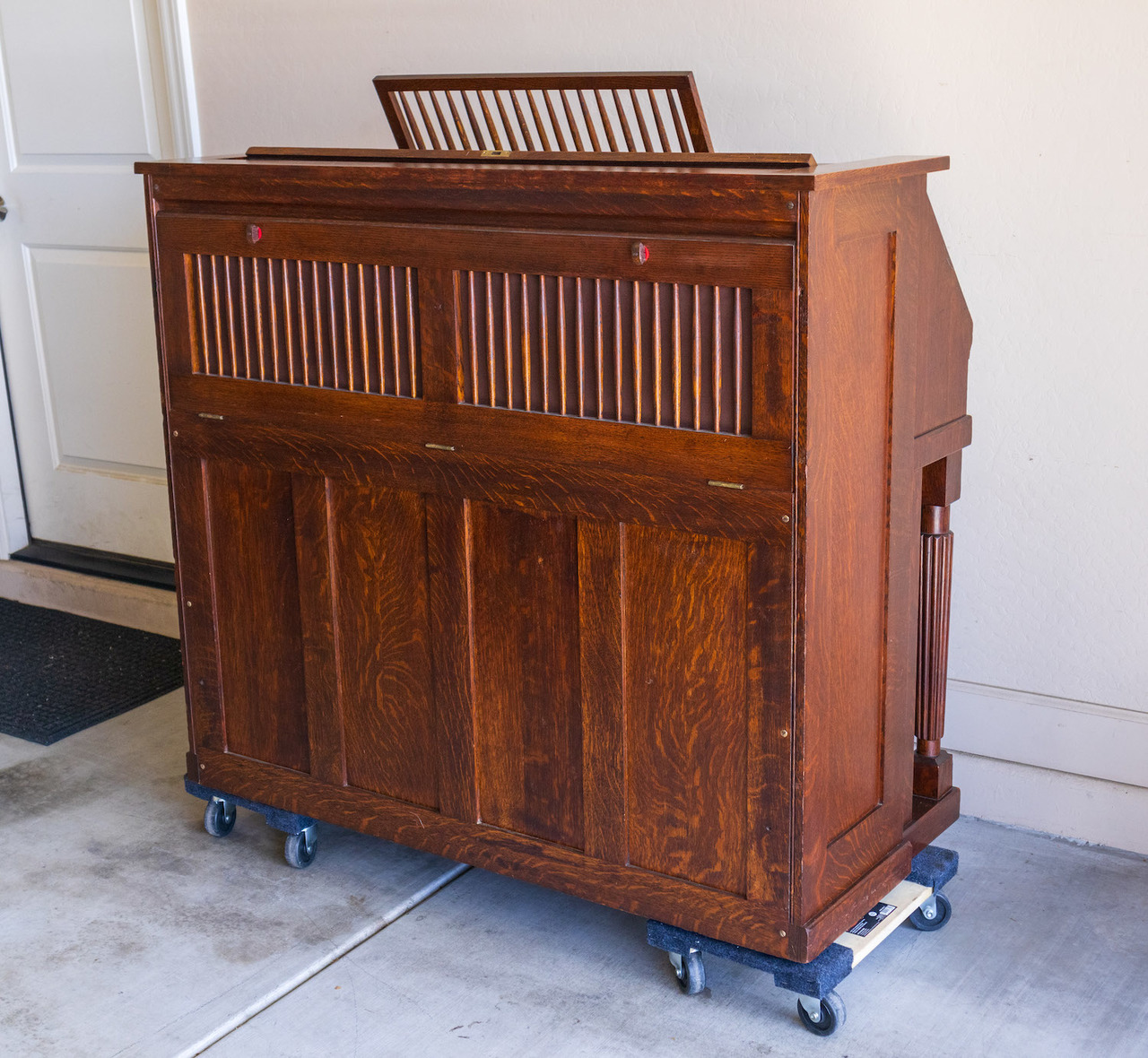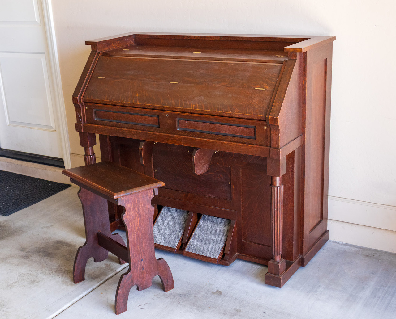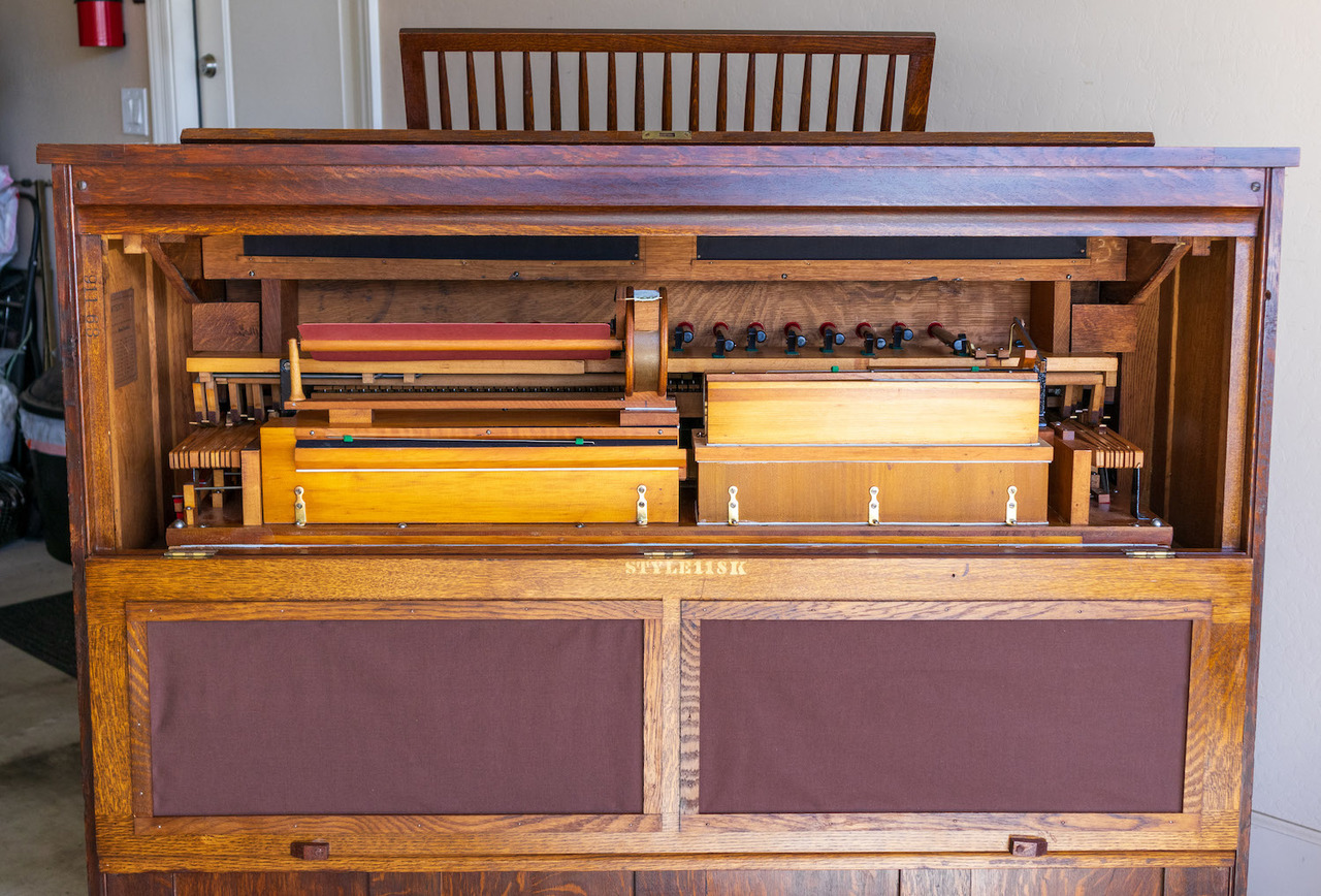 This Style 118K is very similar to a Style 86K with two additional stops -- Sub Bass Dolce and a Baritone 32Ft (in the treble). The prior owner said that her grandfather had likely purchased this used in the mid-1920s in Los Angeles and it has been in the family ever since. To her knowledge, it never had any restoration work done on the instrument. It was mostly in original condition and was fully restored in the Fall/Winter of 2023/2024. The bench appears to be the original that came with the organ. 1909 date is from writing found on the back of the keyboard frame. Pitch is A438.